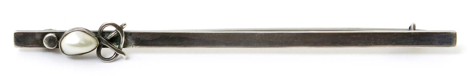 A George Hunt silver and blister pearl bar brooch, slender rectangular bar with Celtic wire knot and applied abelone shell stamped George Huint shield mark, 10cm. long