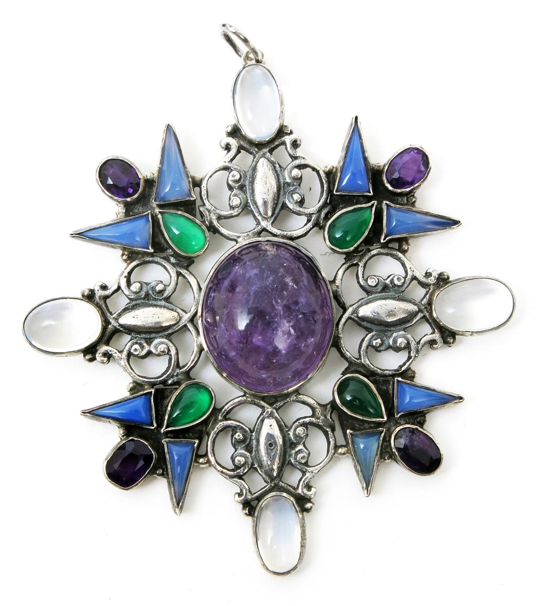 A silver pendant necklace the design attributed to Sybil Dunlop, pierced wirework frame set with amethyst, moonstones and other stones, unmarked, 8cm. wide