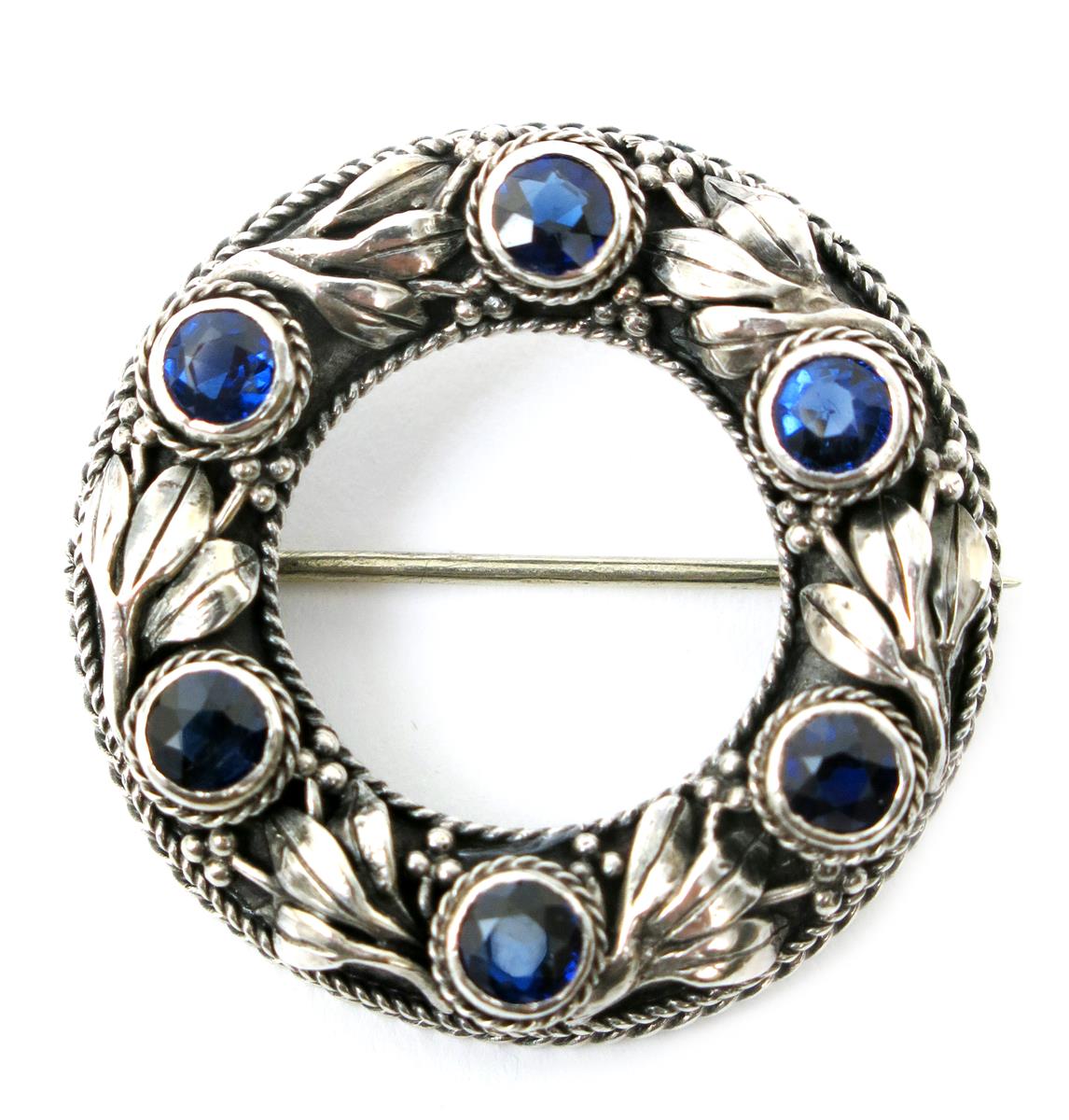 A silver mounted circular brooch in the manner of the Artificers Guild, cast with a frieze of foliage and rope twist borders, set with six sapphire stones, unmarked, 3.5cm diam.