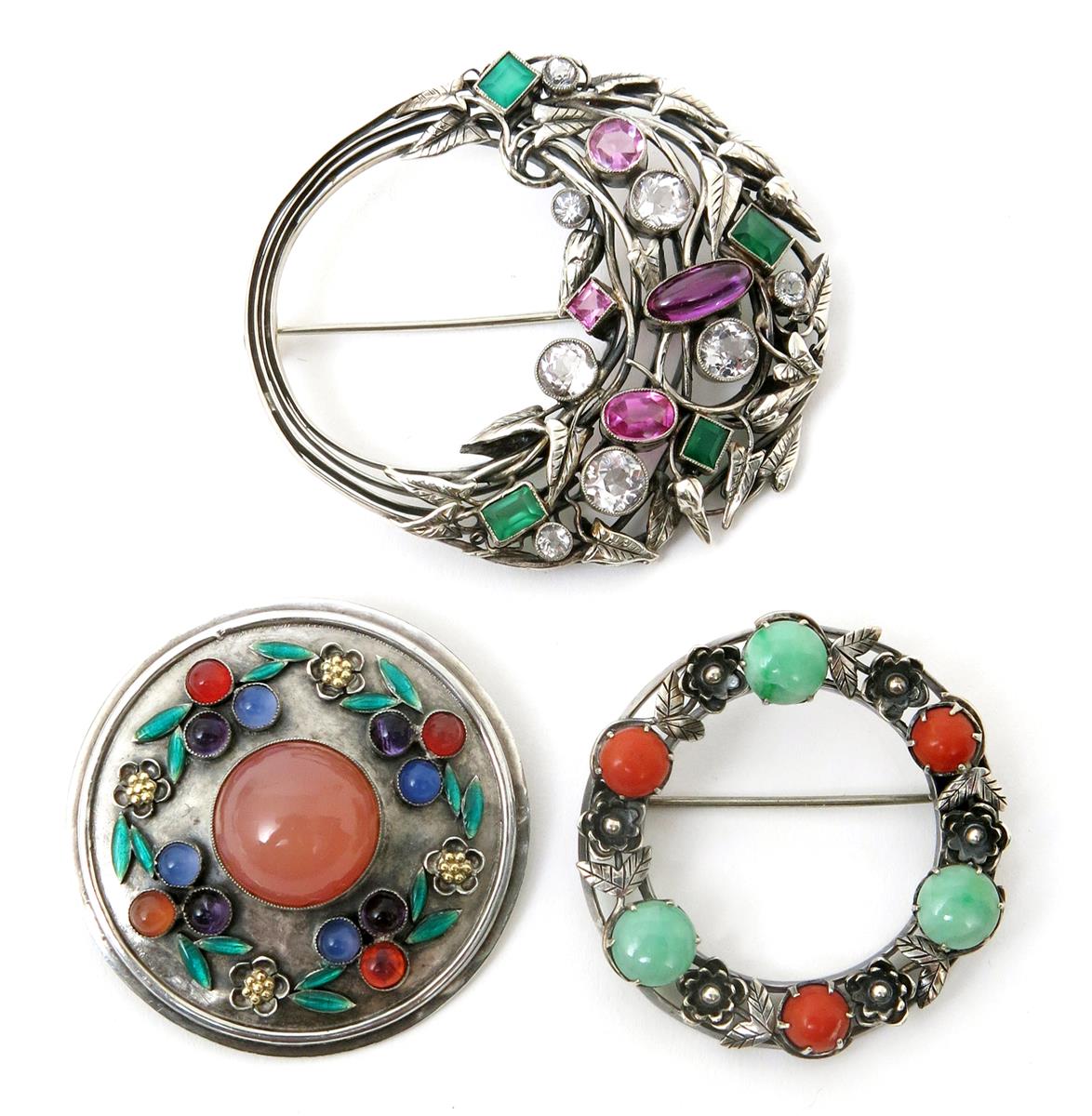 A silver brooch the design attributed to Edith Linnell, wirework foliage cluster set with amethyst, emeralds and other stones, a circular brooch with carnelian and chrysoprase and another, unmarked, 5.5cm. wide (3)