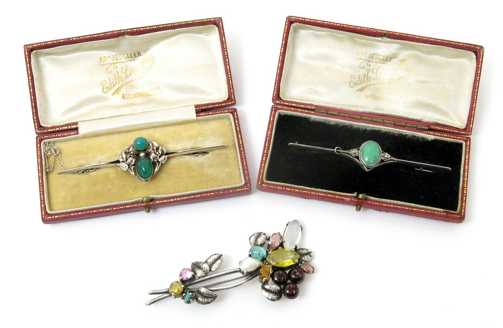 A silver and chrysoprase bar brooch by Edith Linnell, with central pierced and cast foliate panel set with two stones and a seed pearl, in original presentation case, another similar and a silver mounted multi stone bar brooch, case marked Edith Linnell Art Jeweller, 8cm. wide (3)