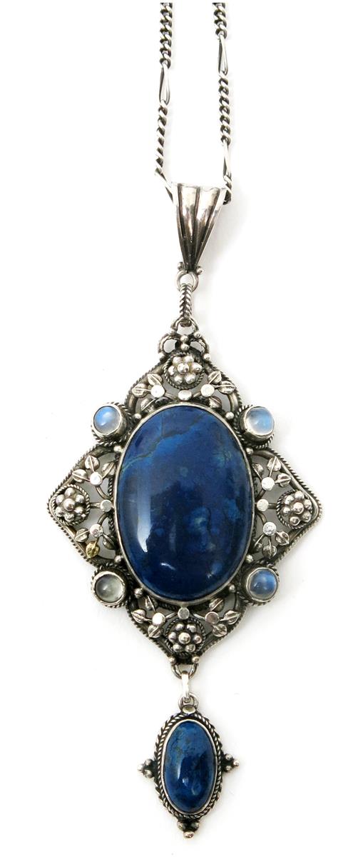 A silver moonstone and lapis pendant necklace in the manner of the Artificers Guild