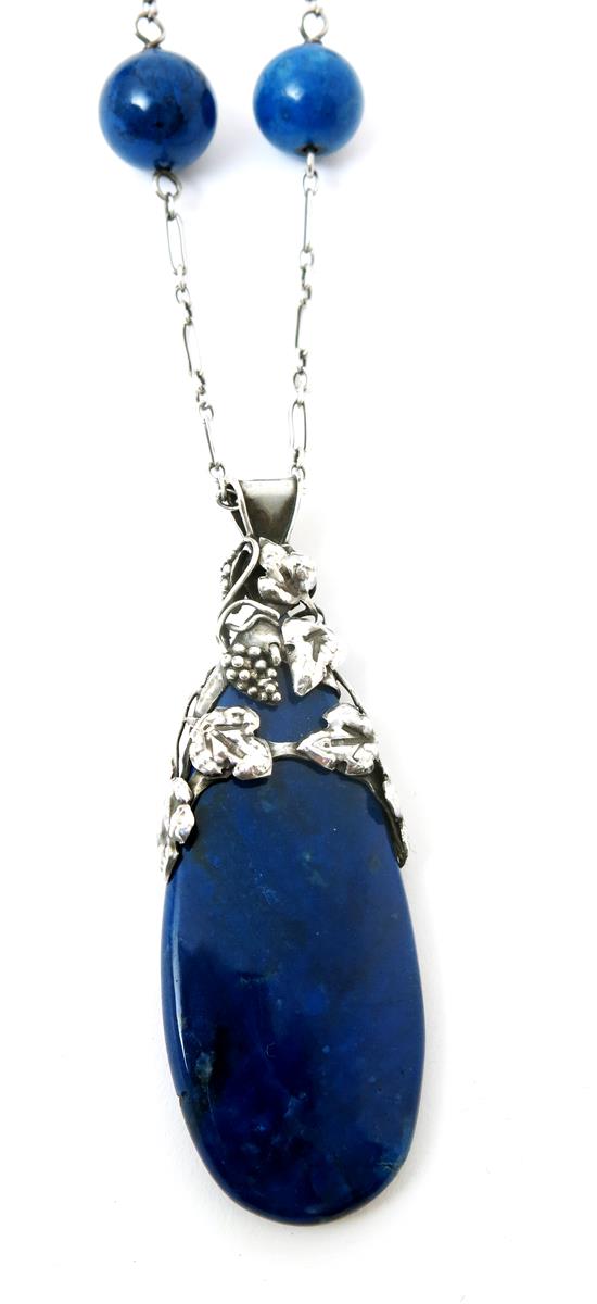 A silver mounted enamel brooch in the style of George Hunt, asymmetric foliate form with central enamel roundel of a woman in profile, a silver and chrysoprase Celtic cross pendant, with enamelled blue and green back, and a silver and lapis pendant necklace and integrated chain in the manner of Sibyl Dunlop, unsigned, 6cm. wide (3)