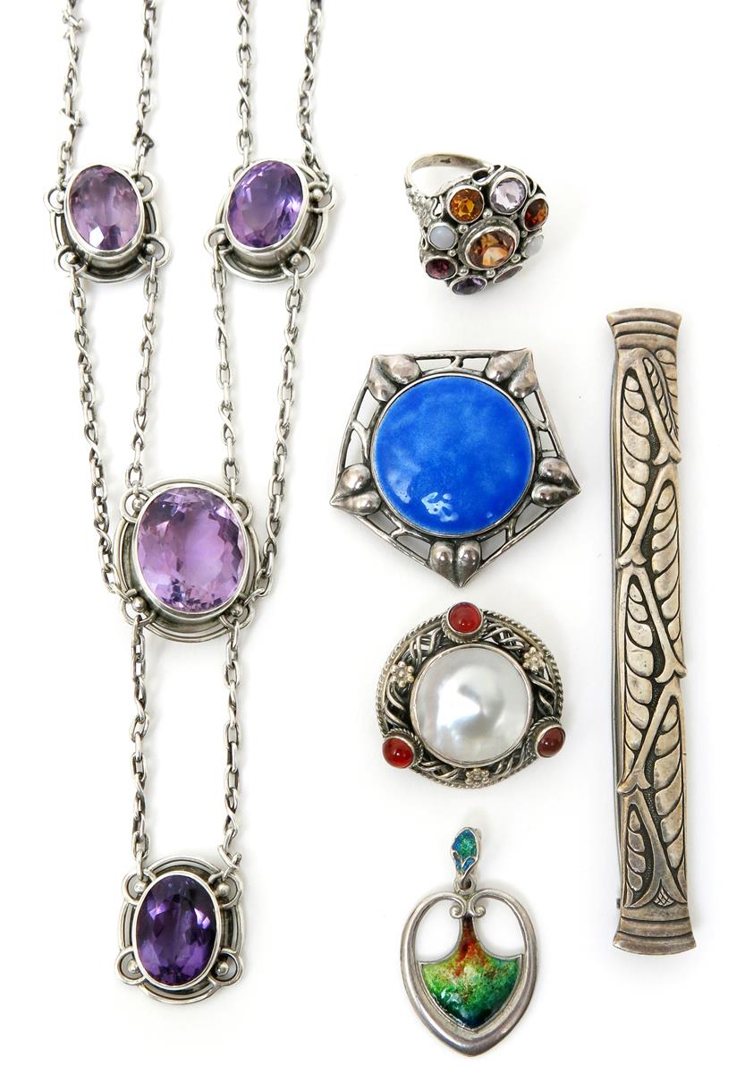 A Murrle Bennett silver and amethyst necklace, a silver bar brooch the design attributed to Bernard Cuzner, a silver and enamel heart shaped pendant by John Baker Bennett, a silver and blister pearl brooch by E.R Minns set with three carnelian stones, a multi stone ring and a Guild of Handicrafts silver and enamel brooch the design attributed to C.R. Ashbee, stamped marks, (6)