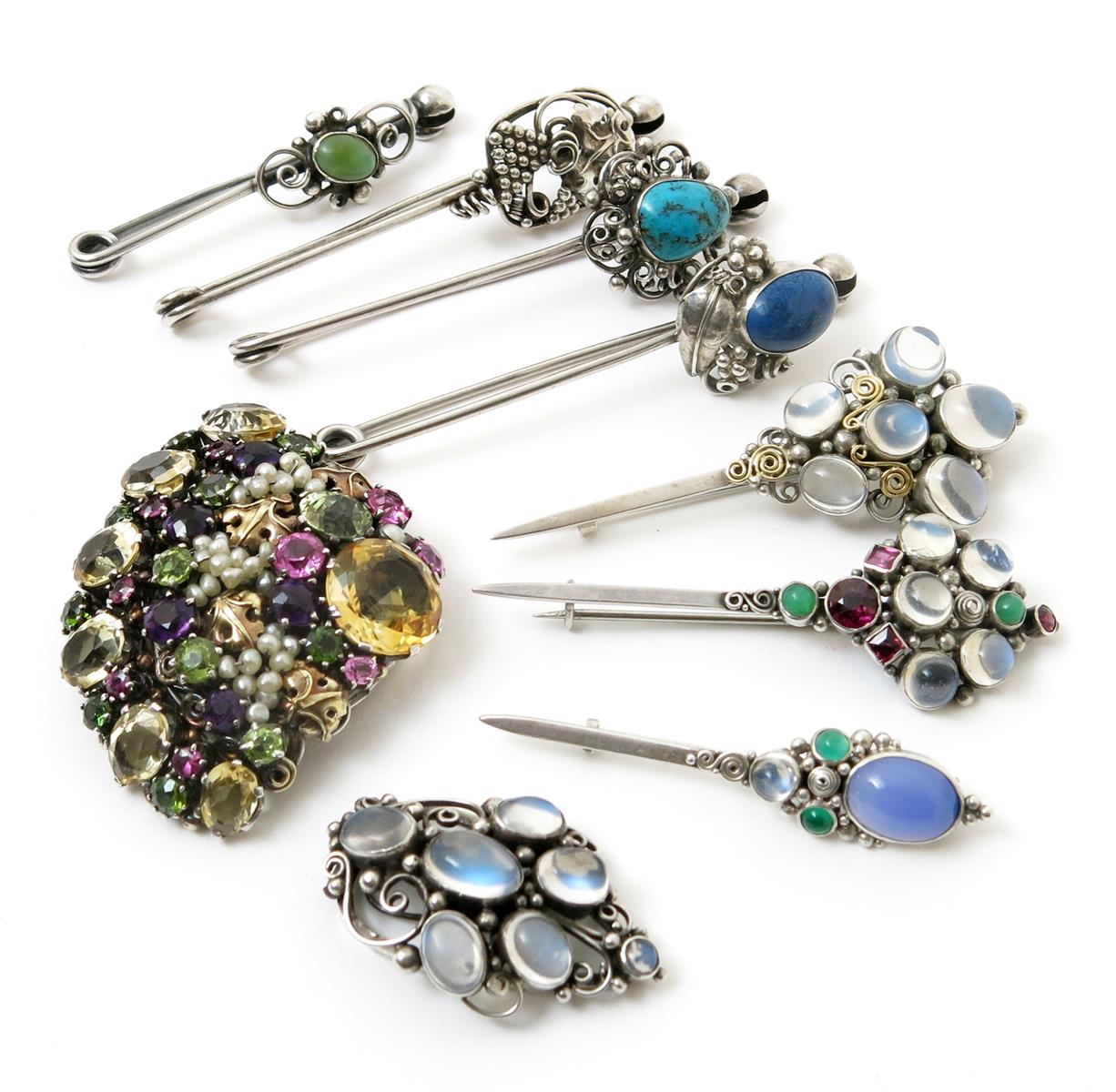 A gem set clip brooch probably by Dorrie Nossiter, a wirework frame set with foliate panels, seed pearls and assorted coloured stones, three kilt pins set with moonstones, another clip brooch set with moonstones and four bar brooches, unmarked, 6cm. wide (9)
