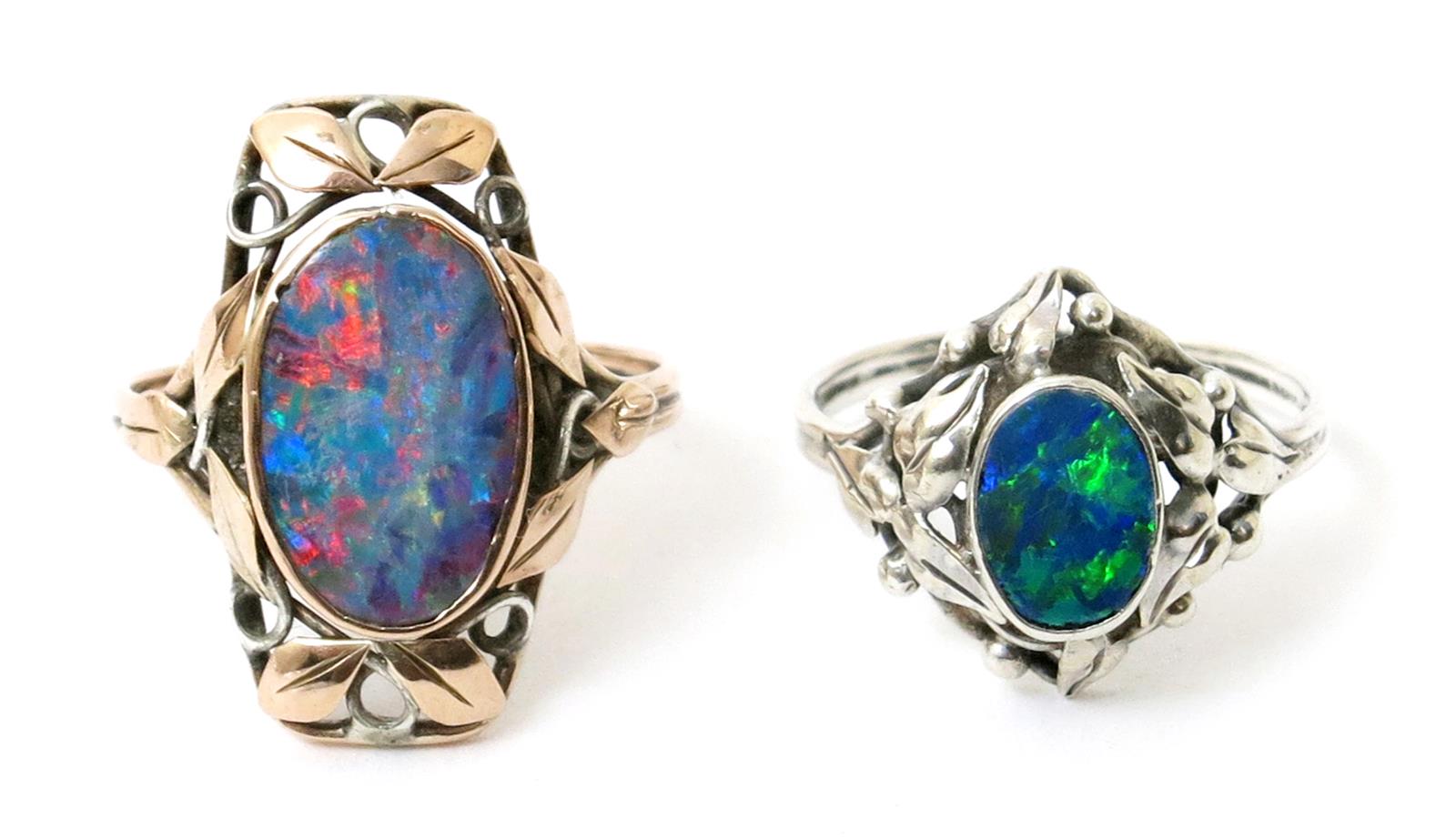 A silver and opal ring the design attributed to Rhoda Wager, simple foliate frame with central opal stone, and another smaller unmarked, (2)