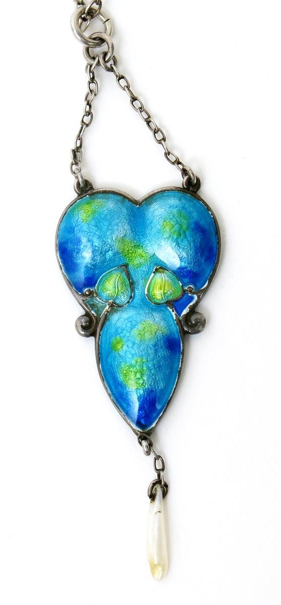 A Gourdel Vales & Co silver and enamel pendant, trilobed form, cast in low relief with foliate borders, enamelled green and blue, with natural pearly slender drop, indistinct marks under enamel, 5cm. long