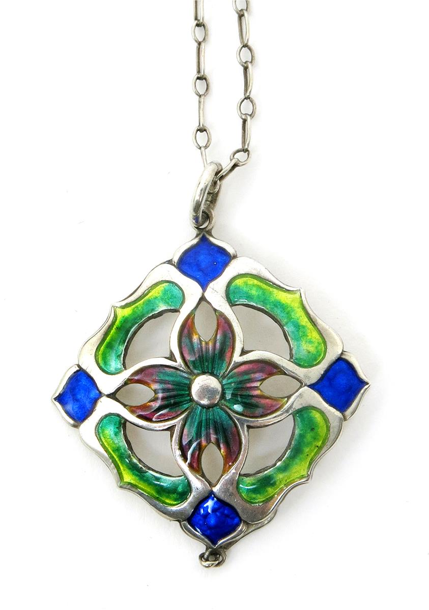 A Smith & Ewen silver and enamel pendant, pierced square section, cast in low relief and enamelled with simple flower head design in green, blue and red stamped marks, Birmingham 1909, 4.5cm. long