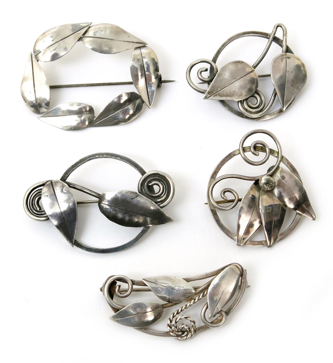 A Gladys & Charles Mumford silver brooch, circular wirework form with foliate panels and scroll S, another similar and three other brooches stamped silver, 3.5cm, wide, (5)