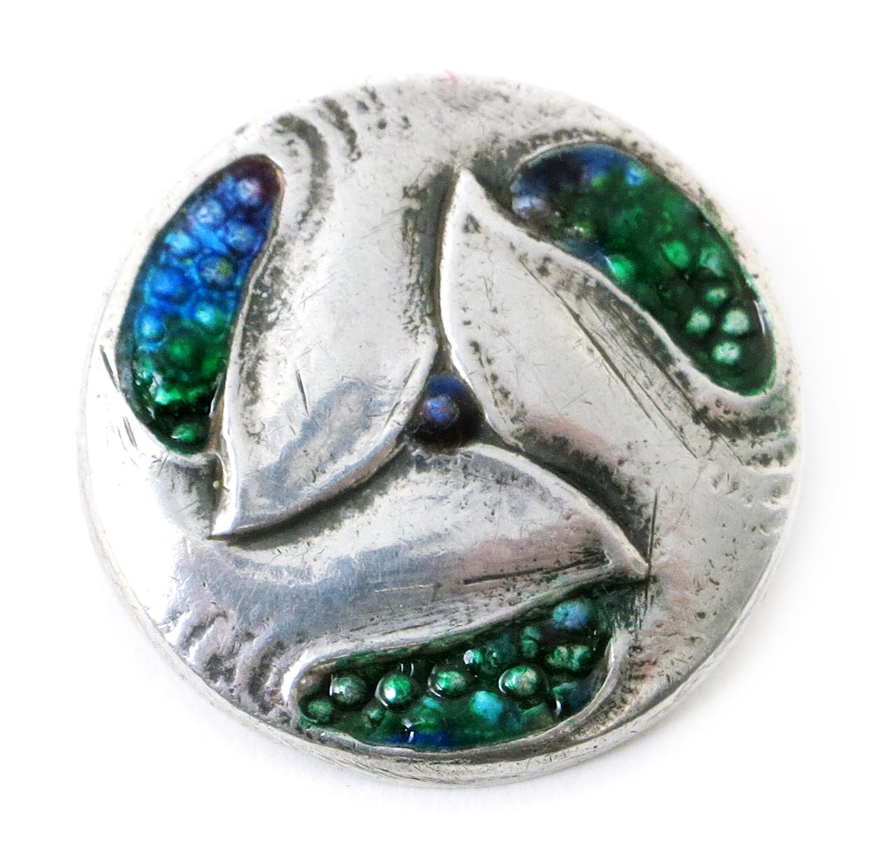 A silver and enamel brooch after a design by Archibald Knox, probably J B Bennett & Co, circular, cast in low relief with foliate panels, enamelled green and blue, stamped J B B & Co, Silver, 2.5cm. diam.