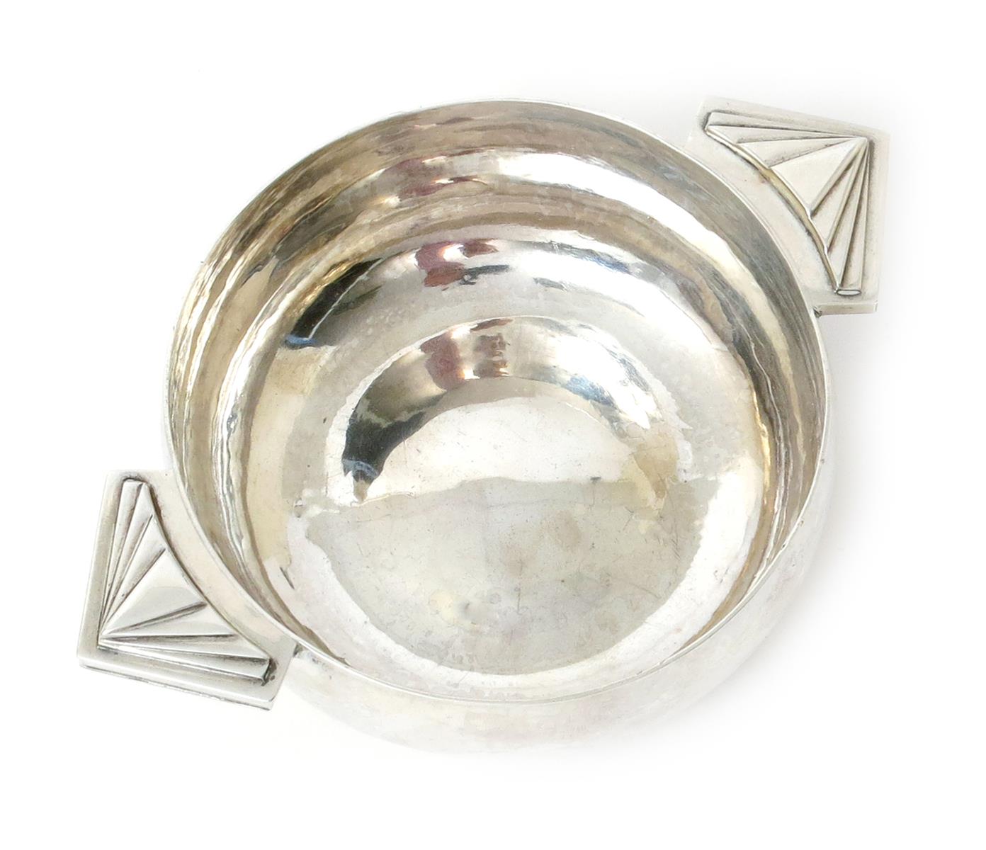 An R.E. Stone silver porringer made for The Goldsmiths & Silversmiths Company, with cast faceted triangular handles, hammered finish, stamped marks, London 1938, 16cm. wide