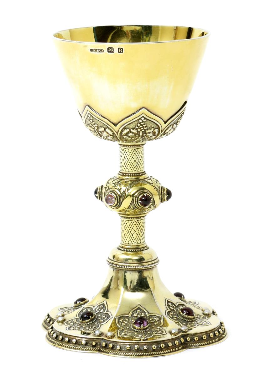 A John Hardman & Co silver-gilt chalice the design attributed to John Hardman Powell, the hexafoil base cast with flowerhead panels set with central garnets, the cylindrical neck engraved with floral diaper work, the knop engraved with leaves and set with garnets and foil-backed quartz stones, the flaring bowl with grape vine border to the base, stamped marks, Birmingham 1866, 17cm. high