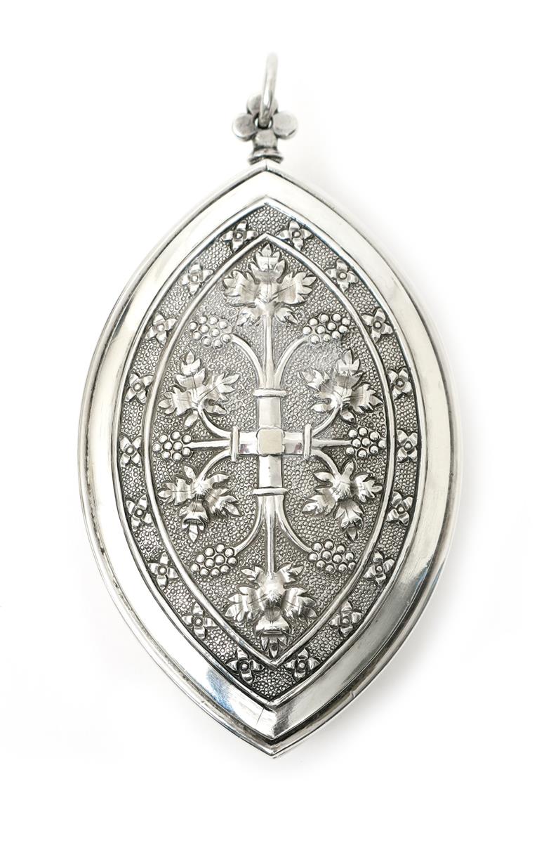 A John Hardman & Company silver travelling communion set, the elliptical case cast in low relief with fleur de lys and berried foliage design, containing silver gilt cup and cover, stamped marks, Birmingham 1868, 11cm. wide (3)