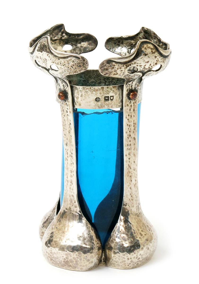 An Art Nouveau William Hutton & Sons Ltd silver vase the design attributed to Kate Harris, retailed by Connell, with blue glass liner, the vase constructed with four hammered foliate panels riveted to a central collar, stamped marks, London datemark rubbed,, blue glass liner broken, 13.5cm. high