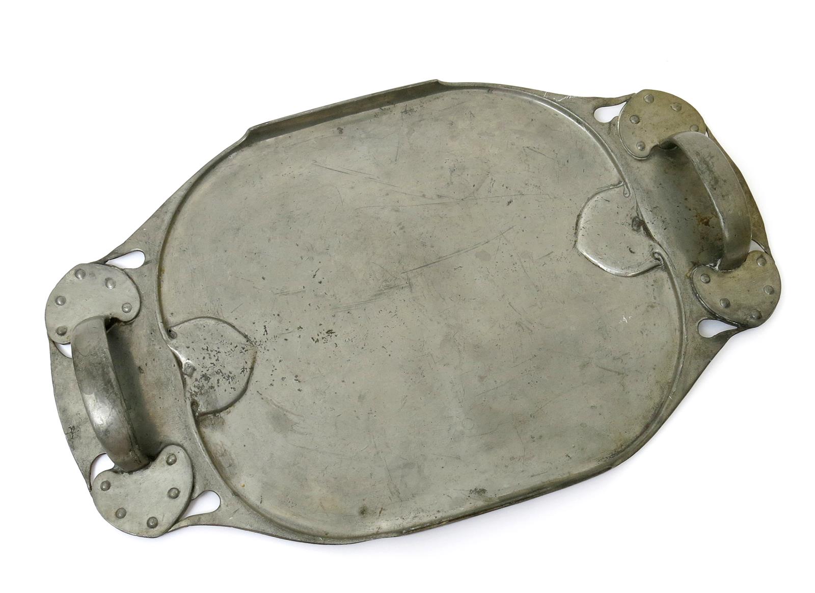 A Liberty & Co Tudric Pewter tray designed by Archibald Knox, model no.042, with applied strap handles with rivet decoration, stamped marks, 47cm. wide.