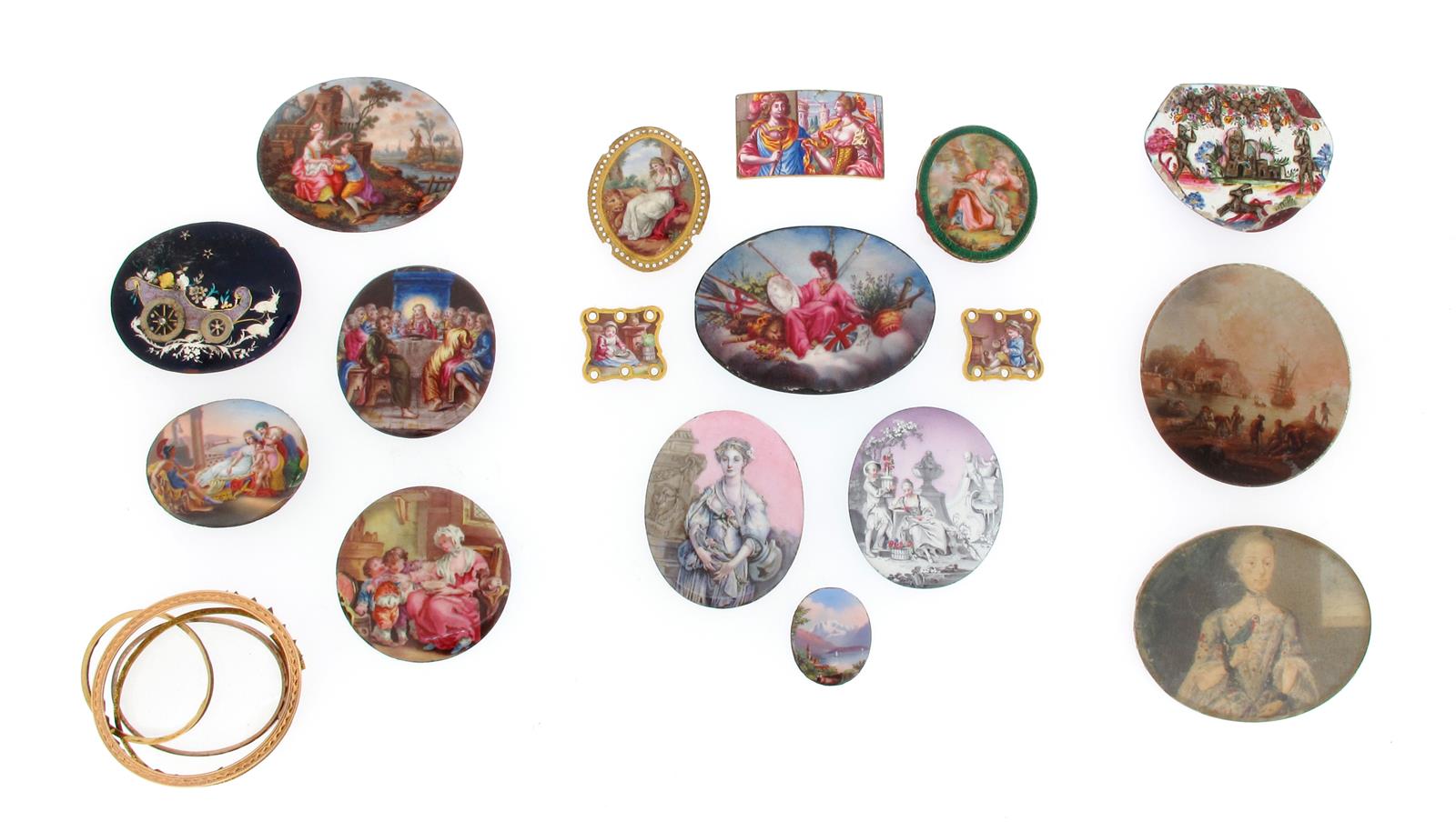 A collection of 18th and 19th century enamel painted plaques, including a pair of gold shaped square-form discs each painted with a child to both sides and pierced with six holes, 2cm wide. An oval plaque painted with Britannia holding a shield illustrating King George III, 5.5cm wide. A plaque depicting La Cruche Cassee by Grenze Jean Baptiste. Another similar plaque on pink ground with a young gentleman presenting a seated girl with flowers amongst a classical scene, 4.0cm high. A navette-shaped gold plaque (damaged border) depicting a girl with lion in white pellet border, 3.5cm high. A convex rectangular gold plaque painted with a couple in the classical manner, damaged, 3.5cm wide. Eight further enamel plaques, a portrait miniature of a lady with parrot, a portrait miniature of a ship in coastal scene and four gold frame mounts.