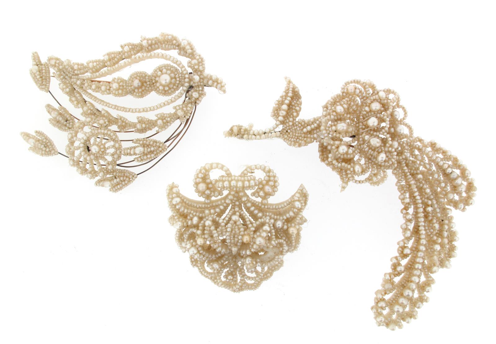 A George III seed pearl-set tremblant foliate brooch, 8cm high. A George III seed pearl-set butterfly brooch. A George III seed pearl-set floral brooch and a George III seed pearl-set stylised giardinetto brooch.