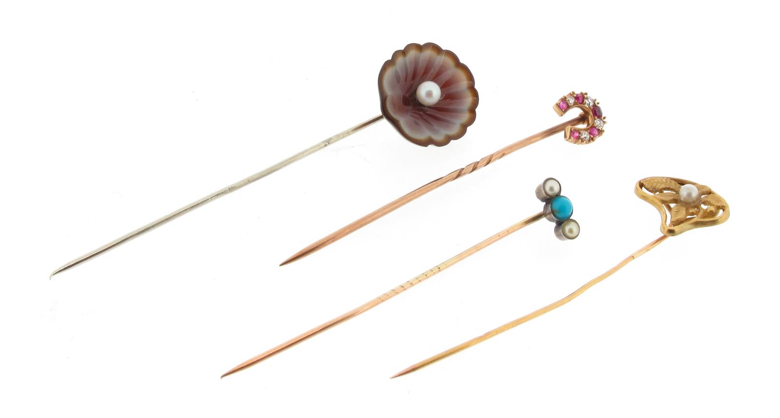 An Art nouveau gold stick pin, of foliate design and set with a pearl. A ruby and diamond horseshoe brooch. An agate stickpin carved in the form of a shell and set with a cultured pearl. And a seed pearl and turquoise mounted stickpin.