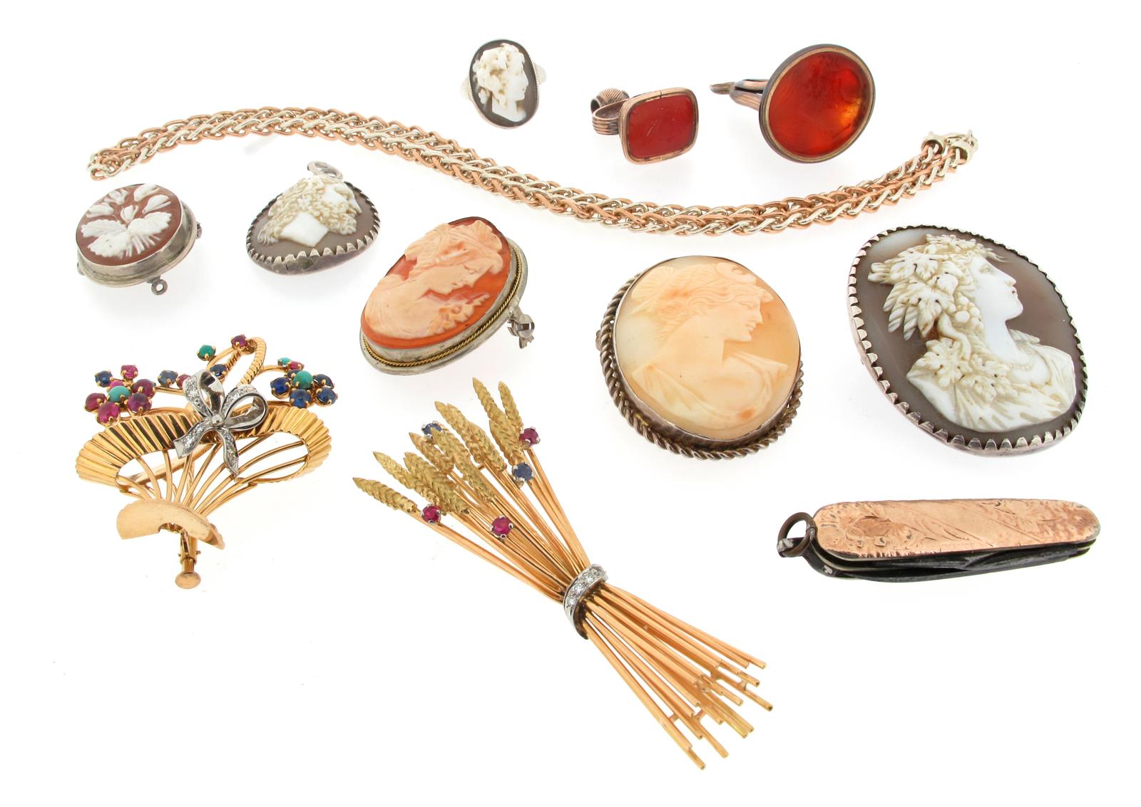 A gem-set yellow gold giardinetto brooch. A sapphire ruby and diamond-set gold brooch designed as a wheatsheaf. A gold penknife. Four shell cameo brooches, a shell cameo pendant and a shell cameo ring. A gold fob seal mounted with a carnelian intaglio carved with the profile of Edmond Halley. A gold cased fob seal set with a carnelian intaglio carved with the portrait of a lady in the classical manner.