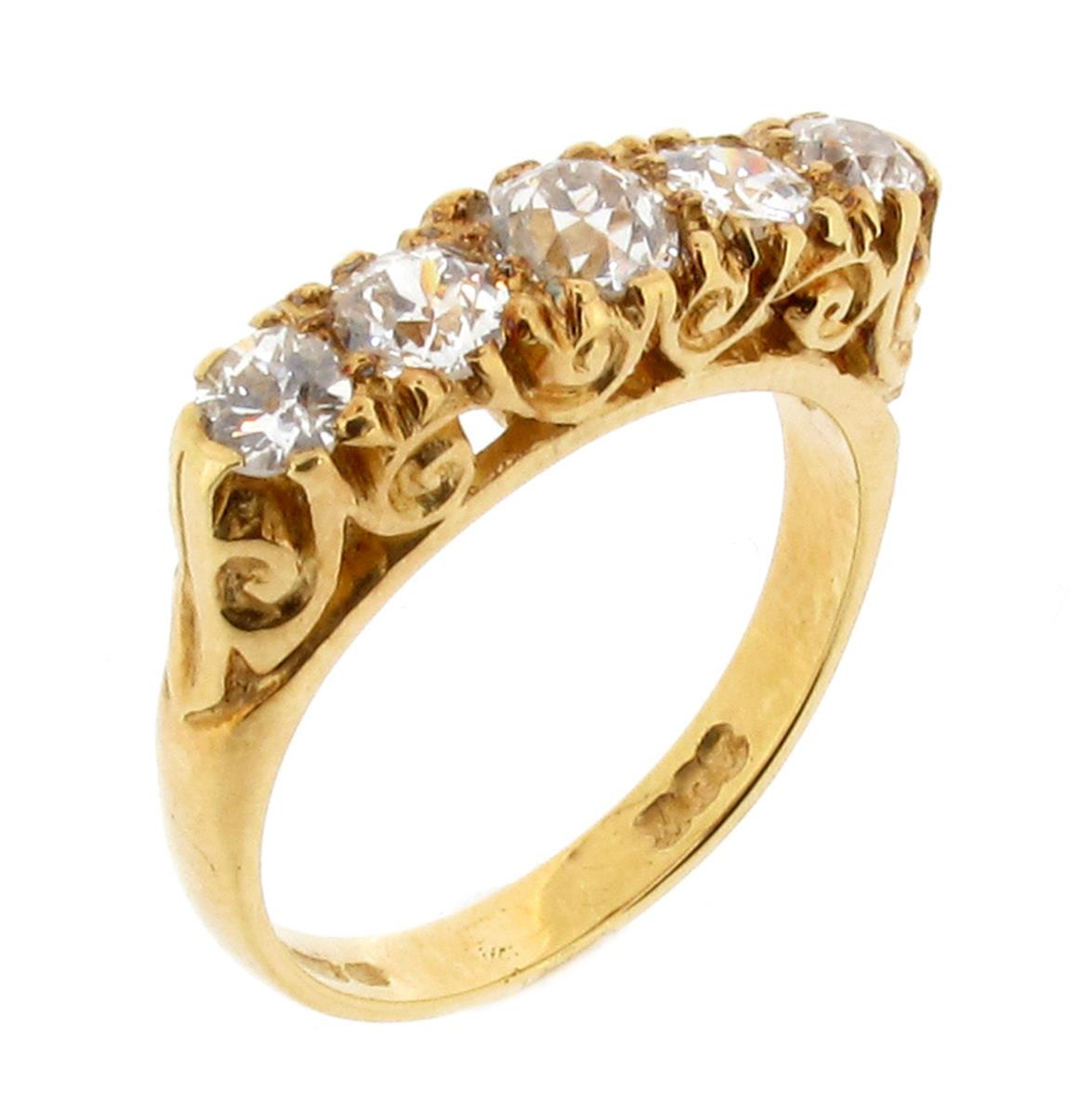 A diamond five stone ring, the graduated old circular-cut diamonds are set in carved and pierced yellow gold shank. With London marks for 1978. Size L.