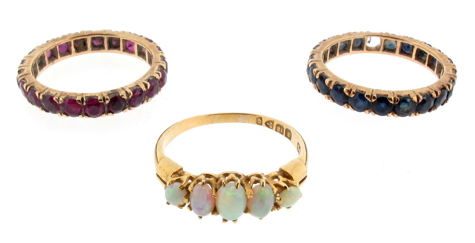 A sapphire full circle eternity ring, (one stone missing), set in yellow gold, size P. A matching ruby full circle eternity ring. Size O 1/2. And an opal five stone ring, set in yellow gold, size N 1/2.