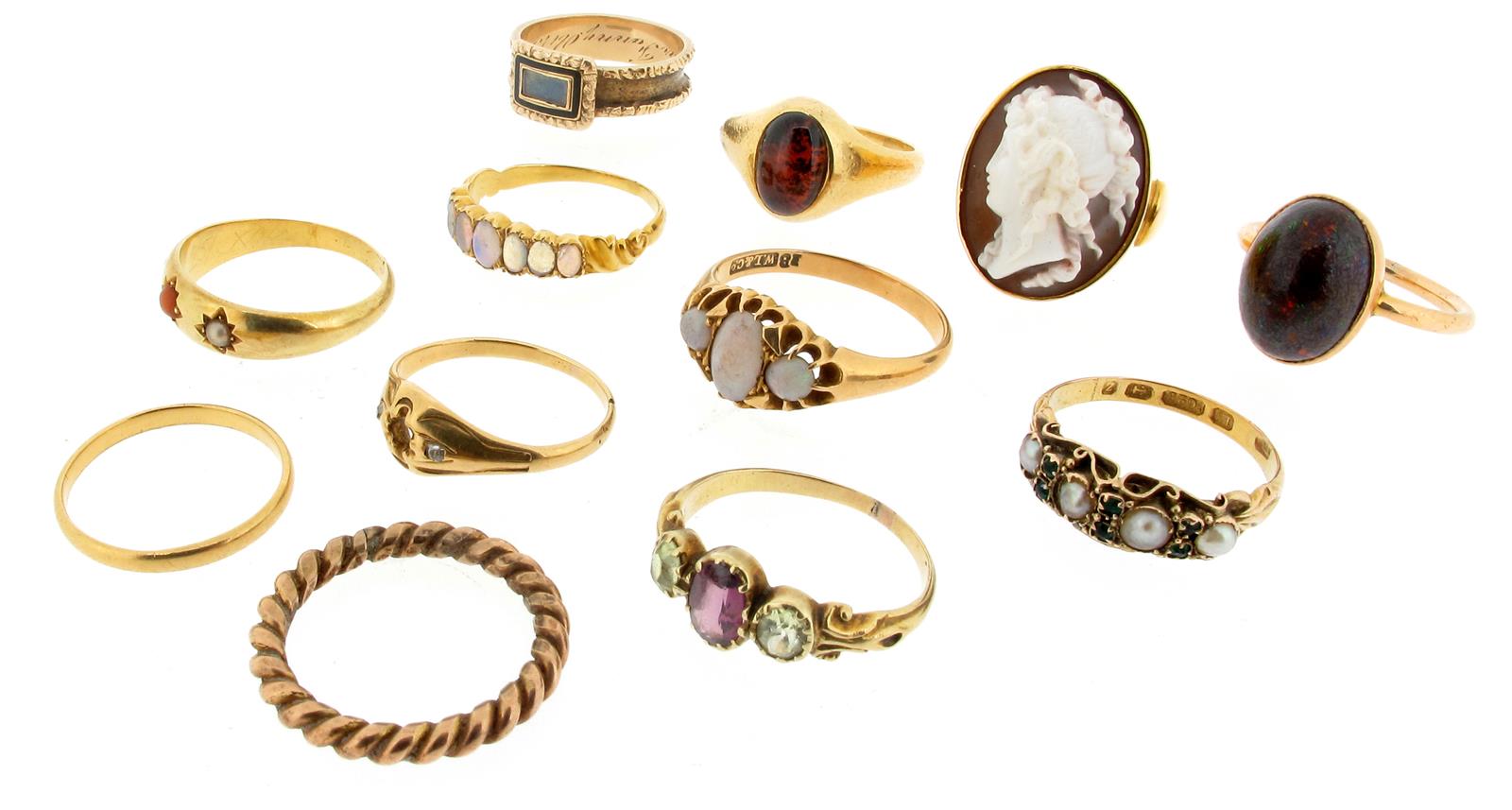 Twelve assorted gold rings, including: a 19th-century mourning ring, a pearl and emerald half hoop ring, an opal seven stone ring, an opal three stone ring, a bolder opal mounted gold ring, a shell cameo mounted gold ring, a coral and seed pearl ring, a diamond ring (damaged) a garnet gypsy ring, a pink and green-stone ring. A twisted rope design gold ring. A plain gold band.