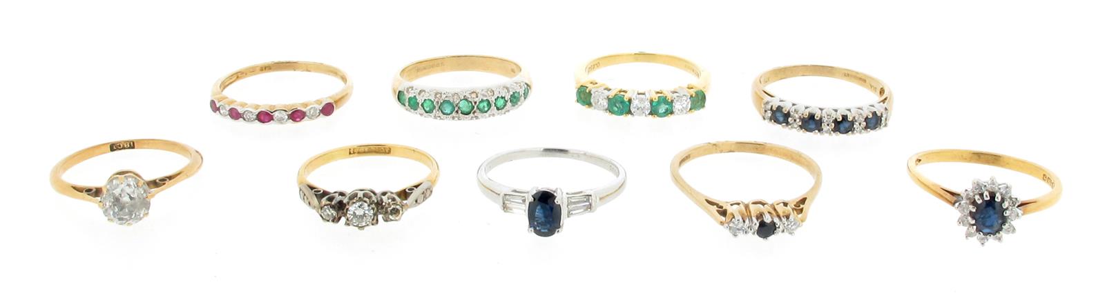 Nine gem-set gold rings, including: a diamond solitaire ring, set in yellow gold size L 1/2. A sapphire and diamond three stone ring, set in white gold, size M. A diamond three stone ring, size K. A sapphire and diamond cluster ring, size P. A ruby and diamond half hoop ring, size P 1/2. A sapphire and diamond three stone ring, size O 1/2. An emerald and diamond half hoop ring, size N 1/2. An emerald and diamond seven stone ring, size N. And a sapphire and diamond half hoop ring, size O 1/2.