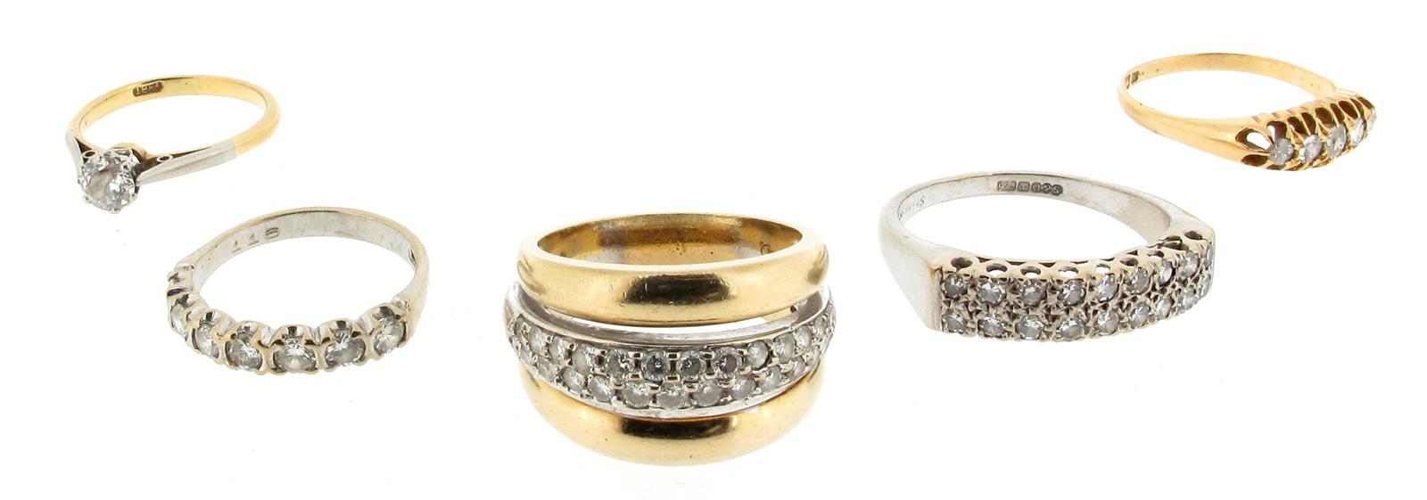 Five diamond rings, including: a diamond solitaire ring, the old circular-cut diamond is set in platinum and gold. Size L 1/2. A diamond half hoop ring, the central panel set with two lines of circular-cut diamonds with gold borders. Size O 1/2. A diamond five stone ring set in yellow gold. Size O 1/2. A diamond seven stone ring, set in white gold. Size M 1/2. A diamond half hoop ring, set with two lines of circular-cut diamonds in white gold. Size U.