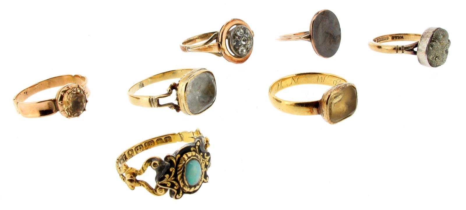Seven antique rings, three gold rings set with a topaz, rock crystal and citrines, a gold glazed ring mounted with plaited hair, a gold ring set with pyrite, a gold ring set with white paste stones and a repair gold ring set with an opal.