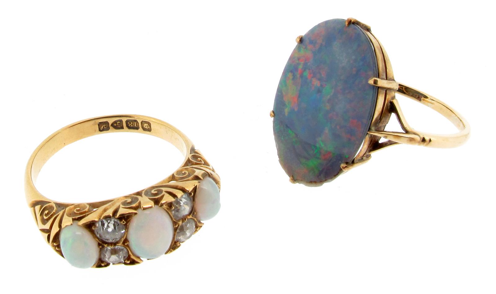 An opal and diamond half hoop ring, set with four old cushion-shaped diamonds and three graduated opal cabochons. Size T. An opal triplet ring mounted in yellow gold. Size S.