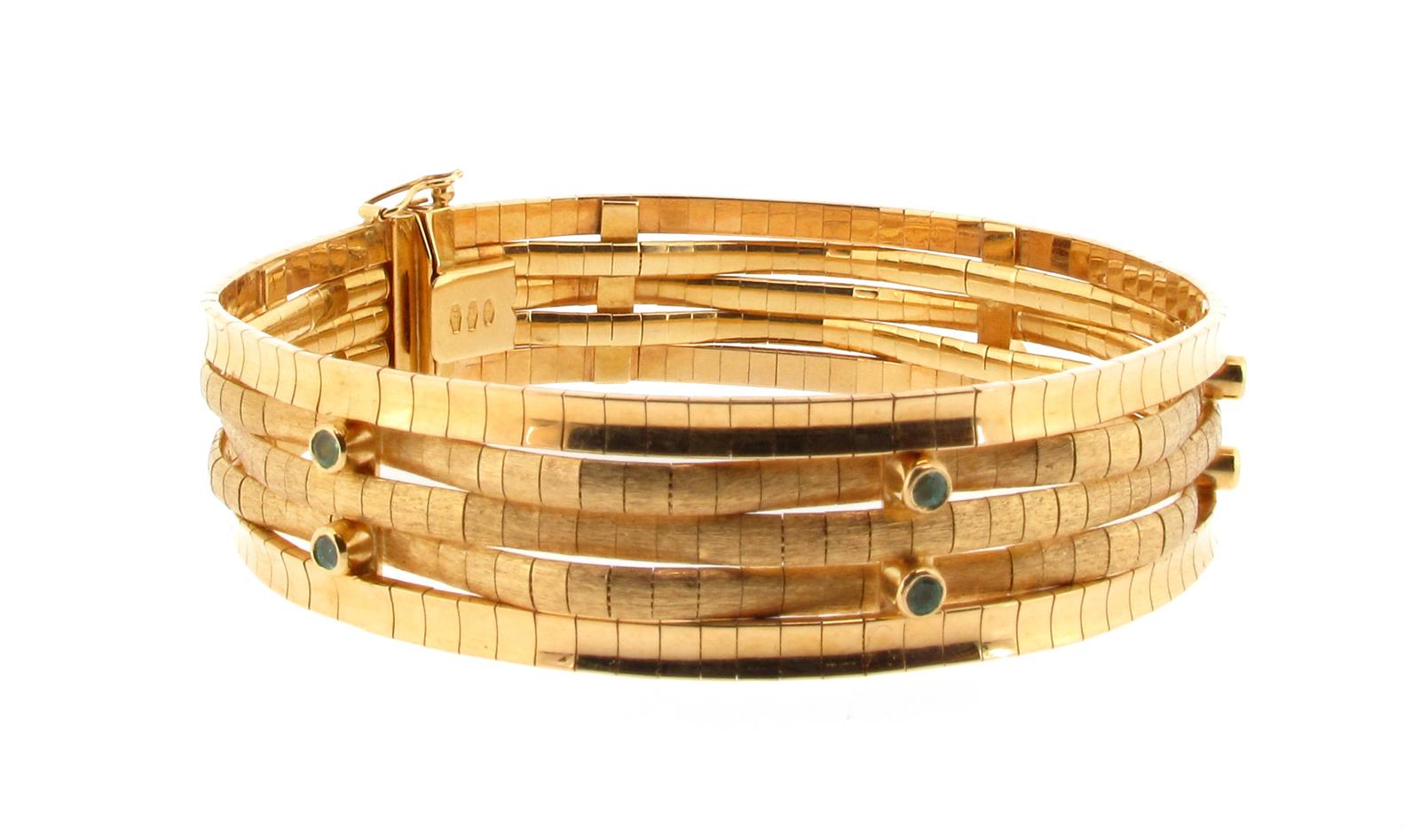 An emerald-set gold bracelet, designed as five articulated lines of textured and plain gold links, set with twelve emeralds. Stamped 750. 20cm long. 40g.