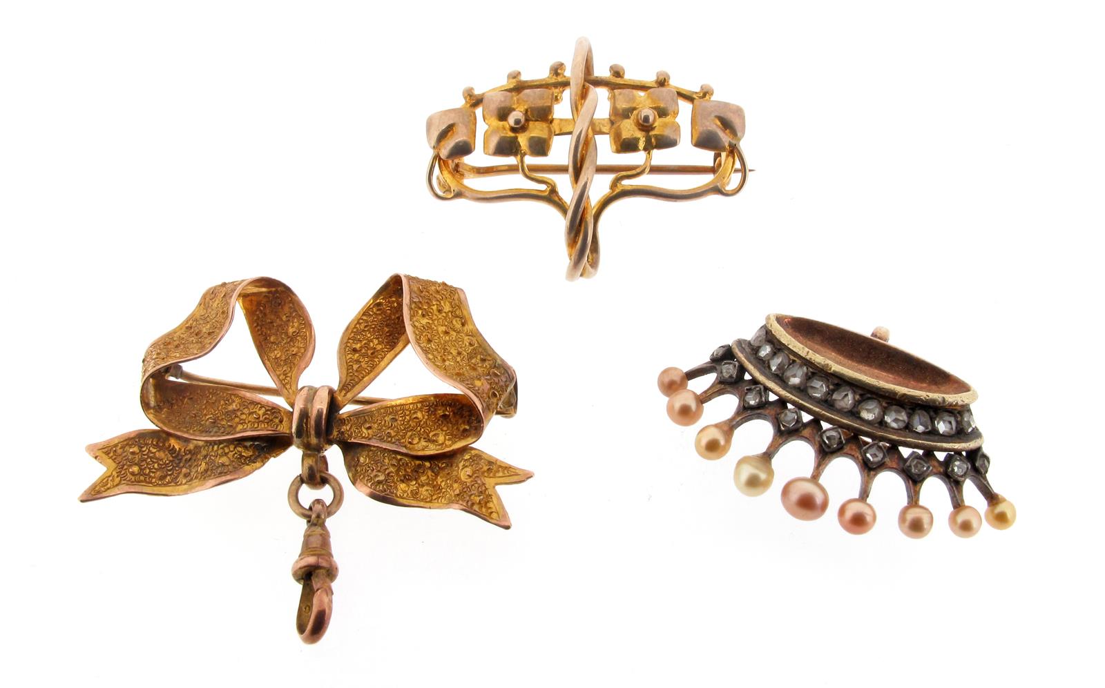 An Art Nouveau gold fob brooch, a gold fob brooch designed as a stylised bow and a silver and gold coronet fob brooch set with diamonds and pearls.