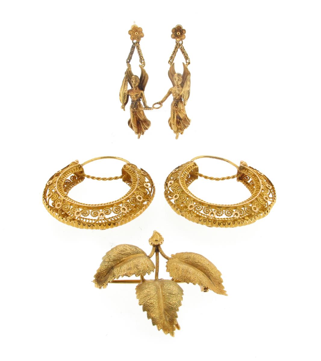 A pair of gold filigree hoop earrings, and a naturalistically formed gold leaf brooch, and a pair of figurative gold earrings.
