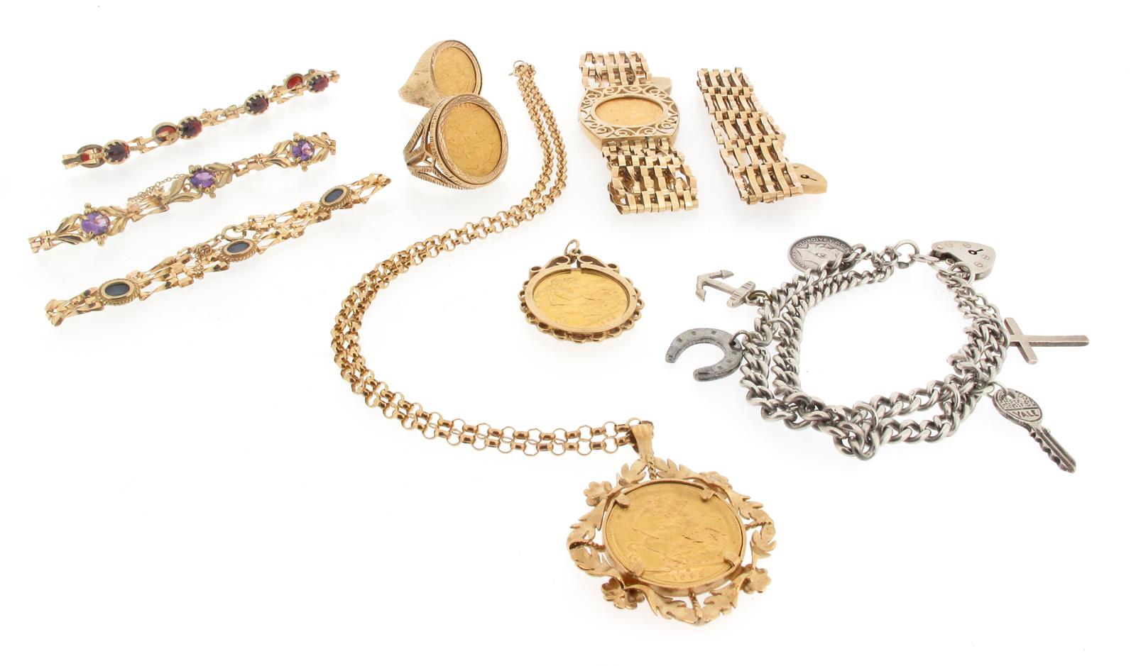 A 9ct gold pendant mounted with an 1893 sovereign, on a fine link gold chain. An 1895 sovereign mounted in a 9ct gold ring. A 9ct gold gate link bracelet mounted with a 1914 half sovereign. A 1958 sovereign mounted gold pendant. A 9ct gold gate link bracelet approximately 87g in total. Three gold bracelets mounted with assorted stones and a silver charm bracelet.