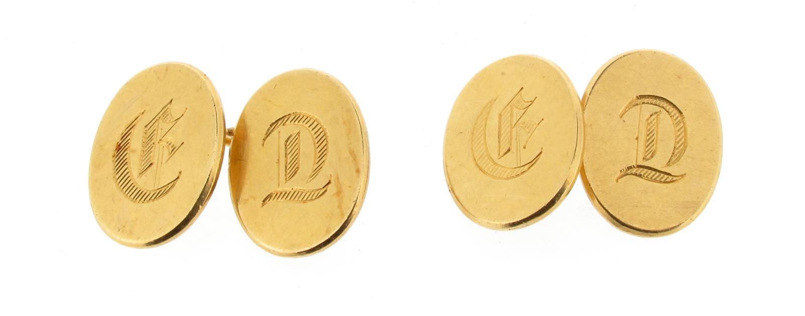 A pair of oval-shaped 18ct yellow gold cufflinks, the solid gold discs are alternately engraved with the intials T and E. Maker's mark G & S. Co. Ltd. London marks for 1918. 19g. Case by Sharman D. Neill Ltd.