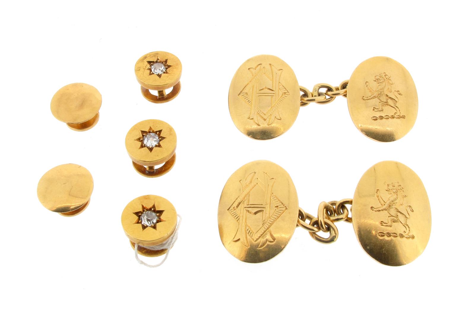A pair of 18ct gold cufflinks, each oval-shaped disc is engraved with a crest or initials, Garrard box. A set of five gold dress studs, three set with a diamond, fitted case.