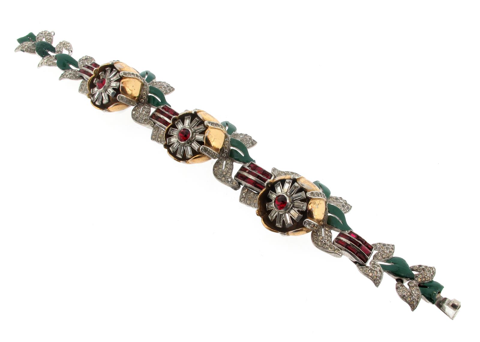 A paste set floral bracelet, comprising three tremblant flower heads with green enamel decoration to the leaves. 20cm.