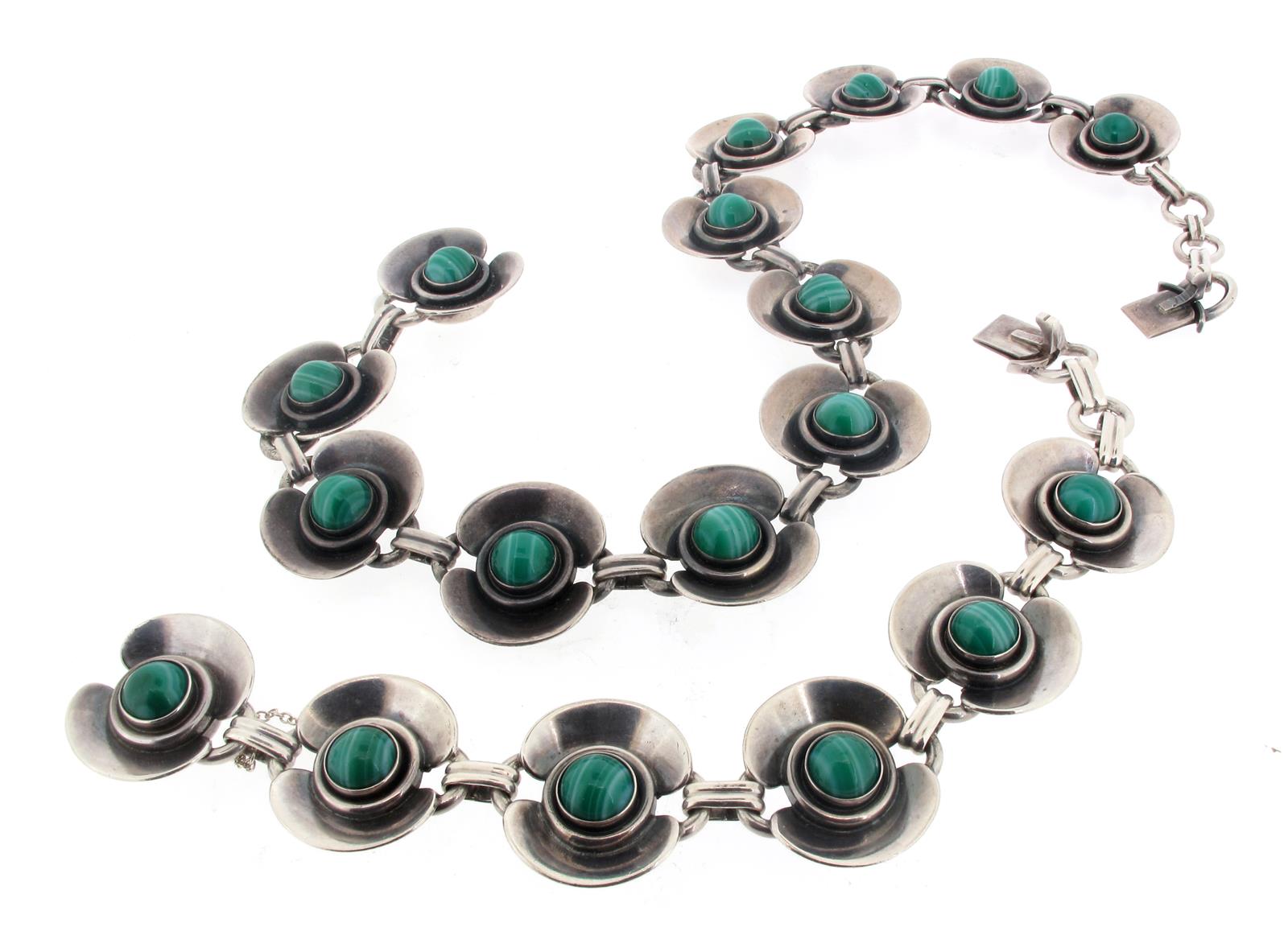 A silver necklace and matching bracelet, the circular disc form links are each centred with a green banded agate cabochon. Signed with initials to the reverse 'DGH' for 'Danske Guldsmedes Haandvaerk'. The bracelet 20.5cm, the necklace 41cm.