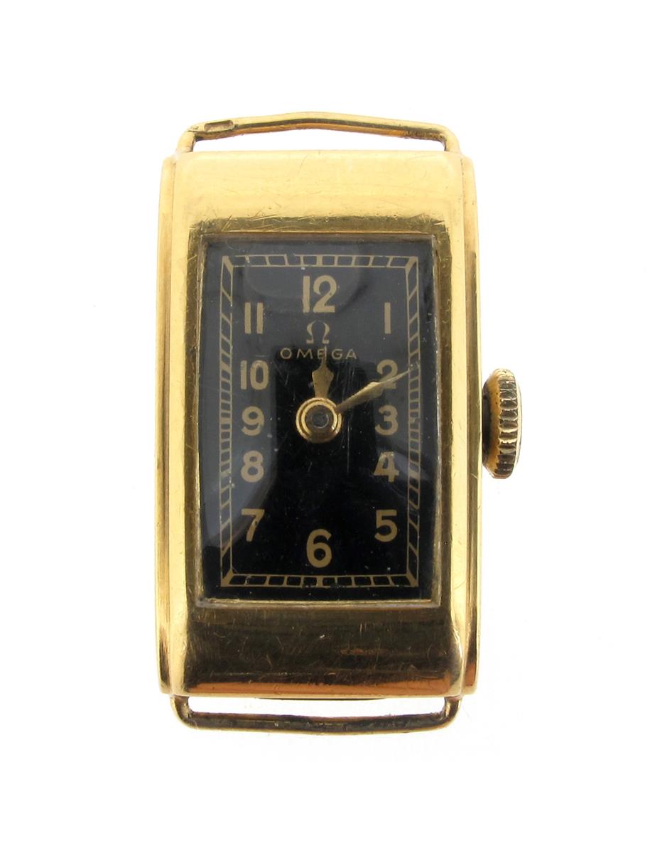 A ladies 18ct gold wristwtch by Omega, the rectangular black dial signed 'Omega' and with Arabic numerals. The case signed 'Omega' and numbered '9400056'. 2.3cm high.