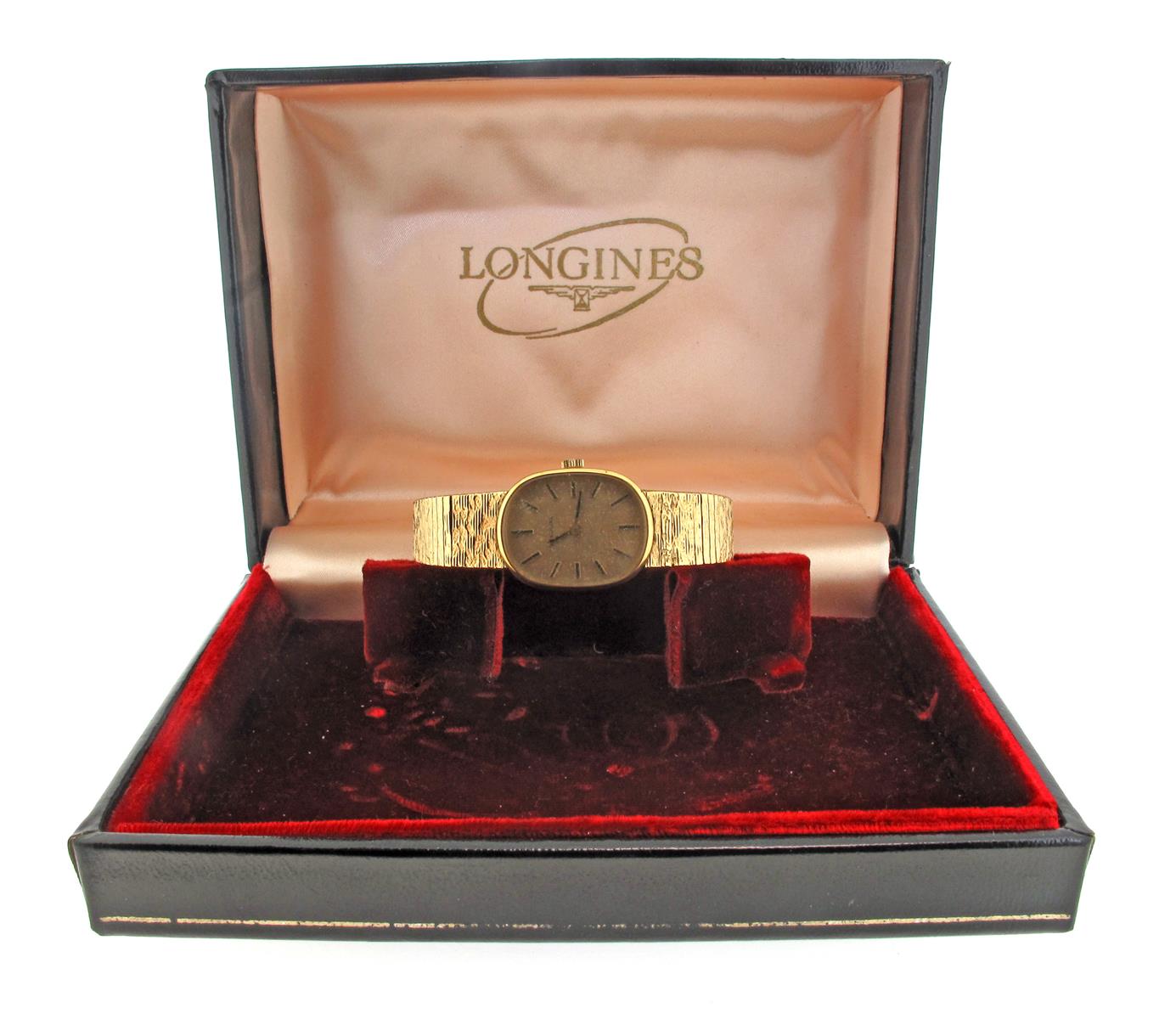 A ladies 9ct gold wristwatch by Longines, the signed plain oval dial with baton numerals. Integrated 9ct gold band. Longines case.