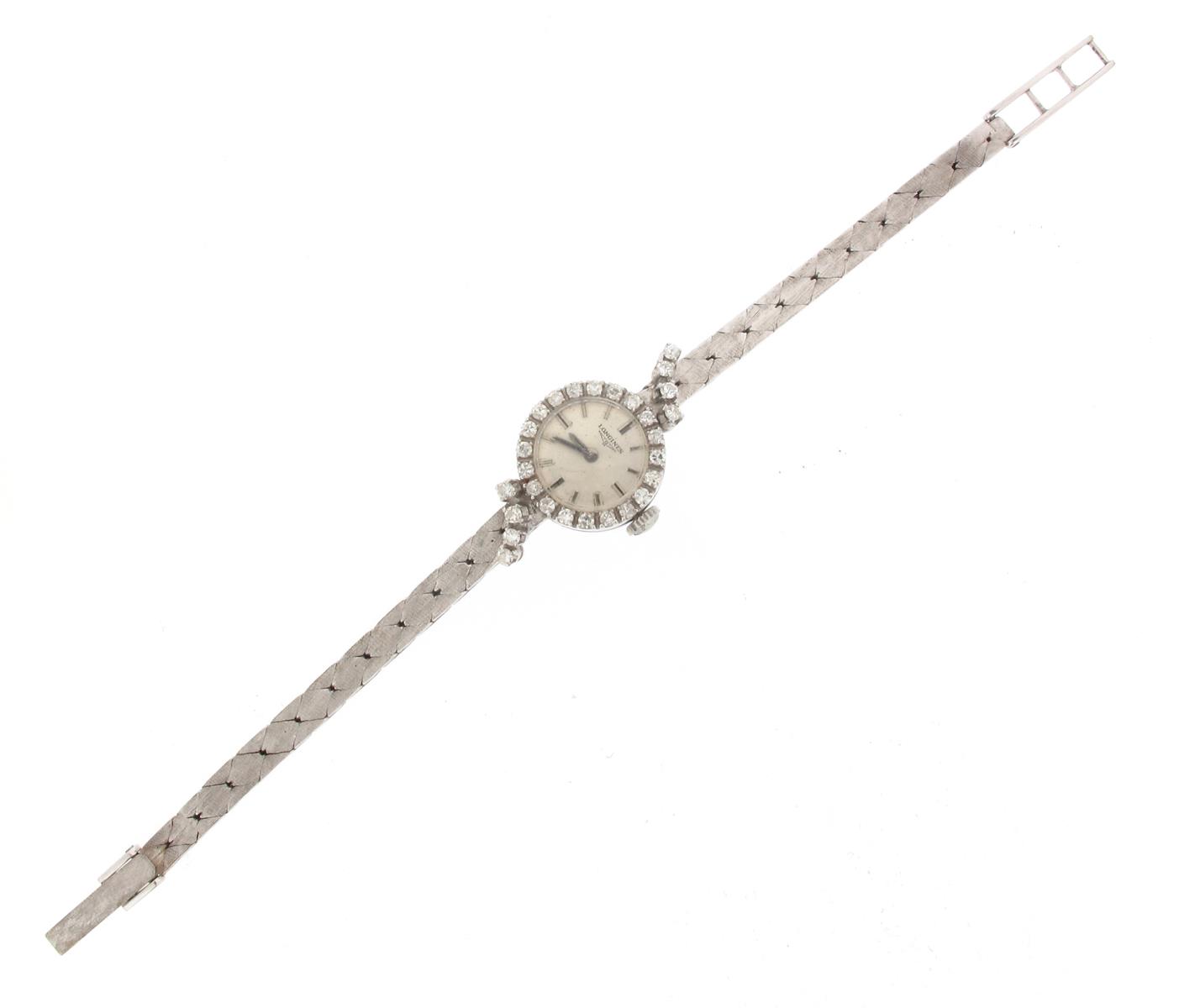 A lady's cocktail wristwatch by Longines, the signed circular dial with baton numerals. Set within a surround of circular-cut diamonds and eight diamonds set to the textured white gold band. 16cm long.