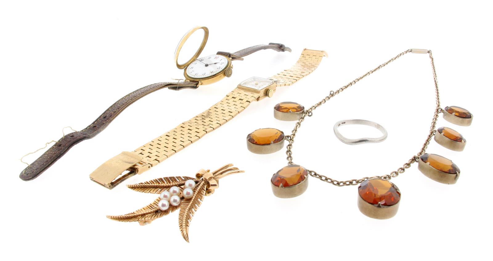 A lady's 9ct gold wristwatch by Rotary, on brick-link gold band. Manual movement. A gold foliate brooch set with cultured pearls. A gold wristwatch on a leather band. A silver wedding band. And a silver necklace suspending a line of graduated citrines.
