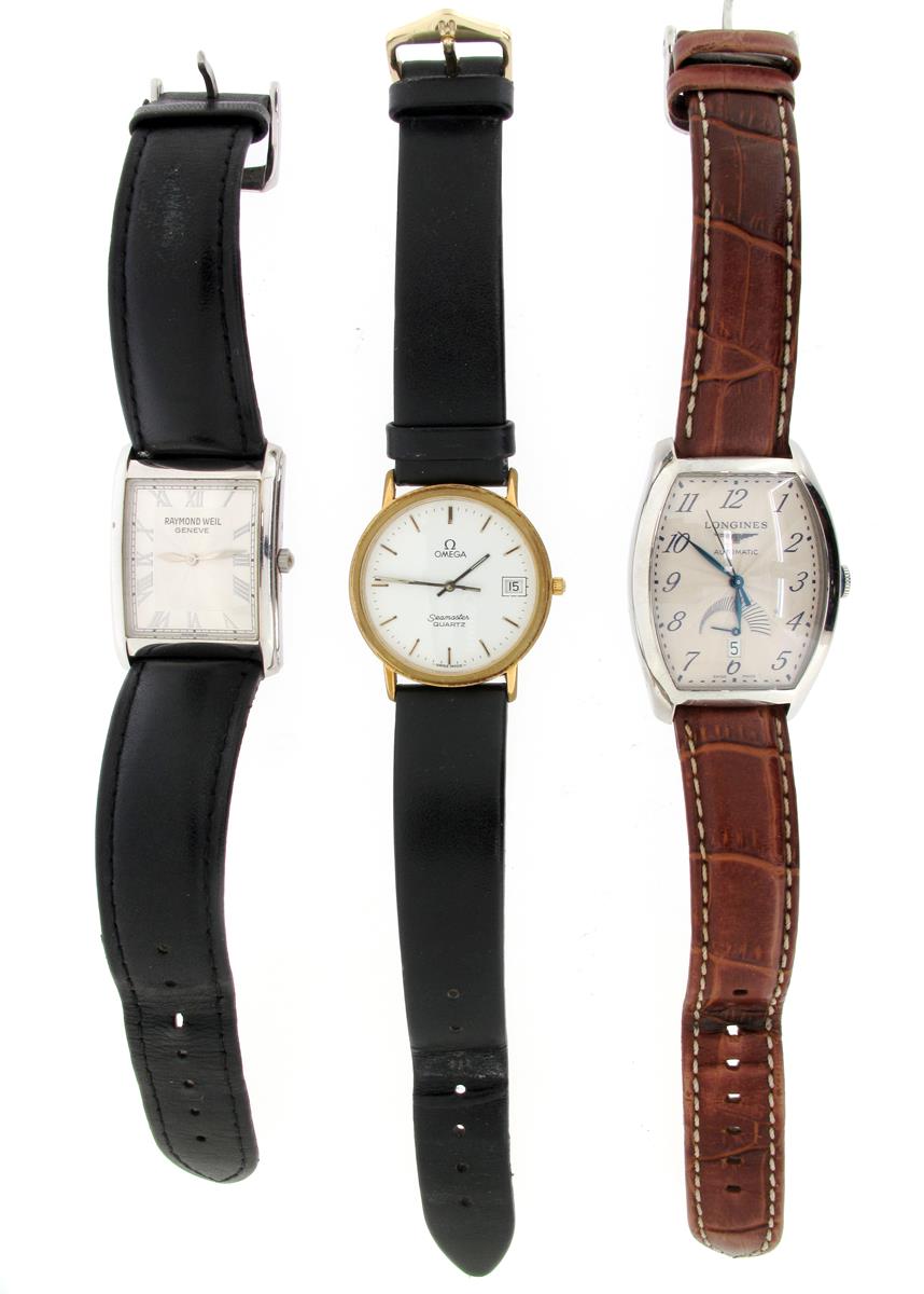 A Longines Evidenza steel wristwatch, the guilloche decorated tonneau dial with black Arabic numerals, swing seconds hand, date aperture and power reserve indication, automatic movement, leather band, Longines case. A Raymond Weil rectangular faced steel wristwatch, quartz movement, leather band, Raymond Weil case. An Omega Seamaster steel wristwatch, quartz movement and date aperture, Omega case.