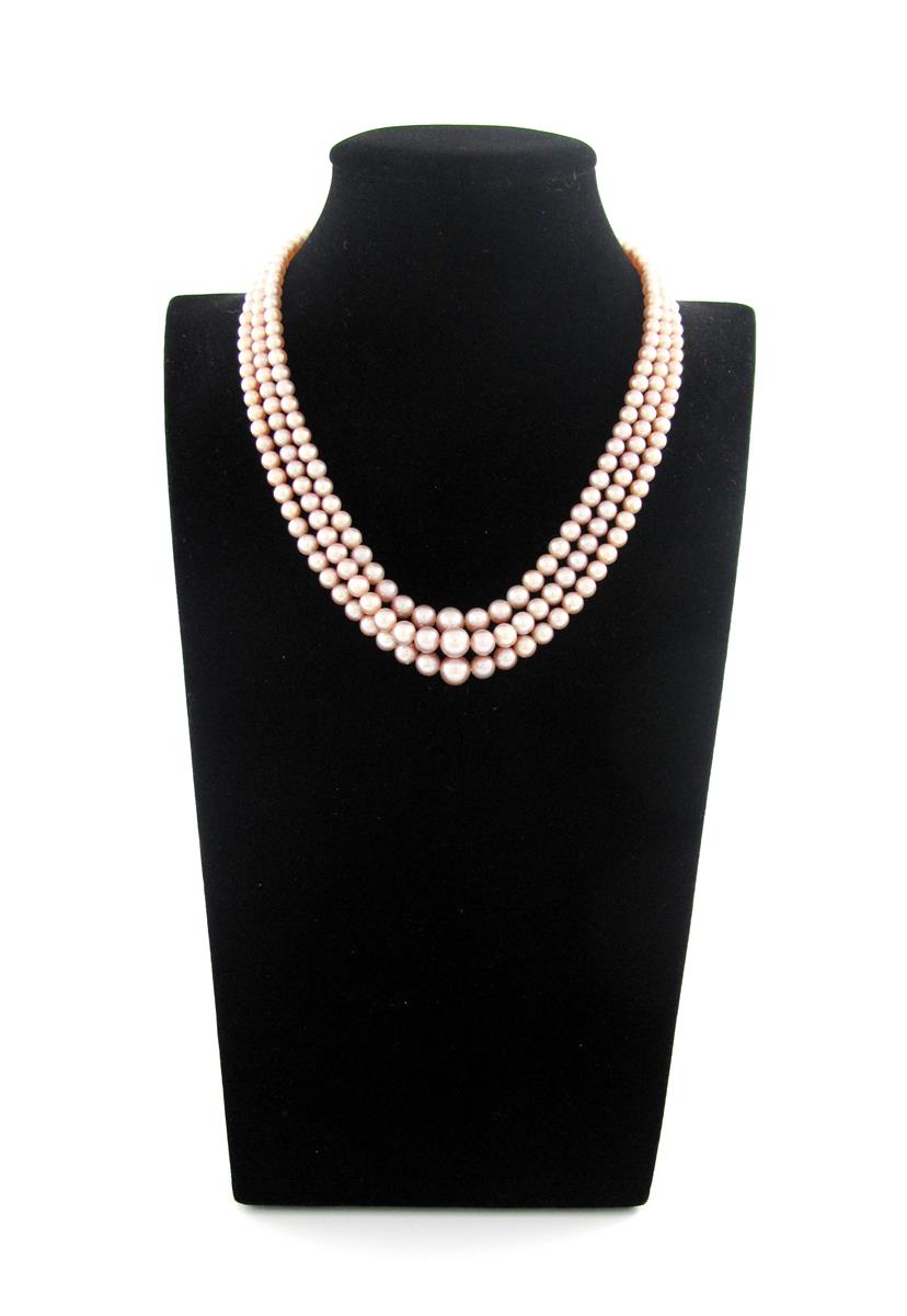 A three row cultured pearl necklace by Garrard & Co, the well-matched pink cultured pearls graduate. With a diamond set platinum and gold clasp signed G & Co, with London import marks for 1995. 43cm longest.