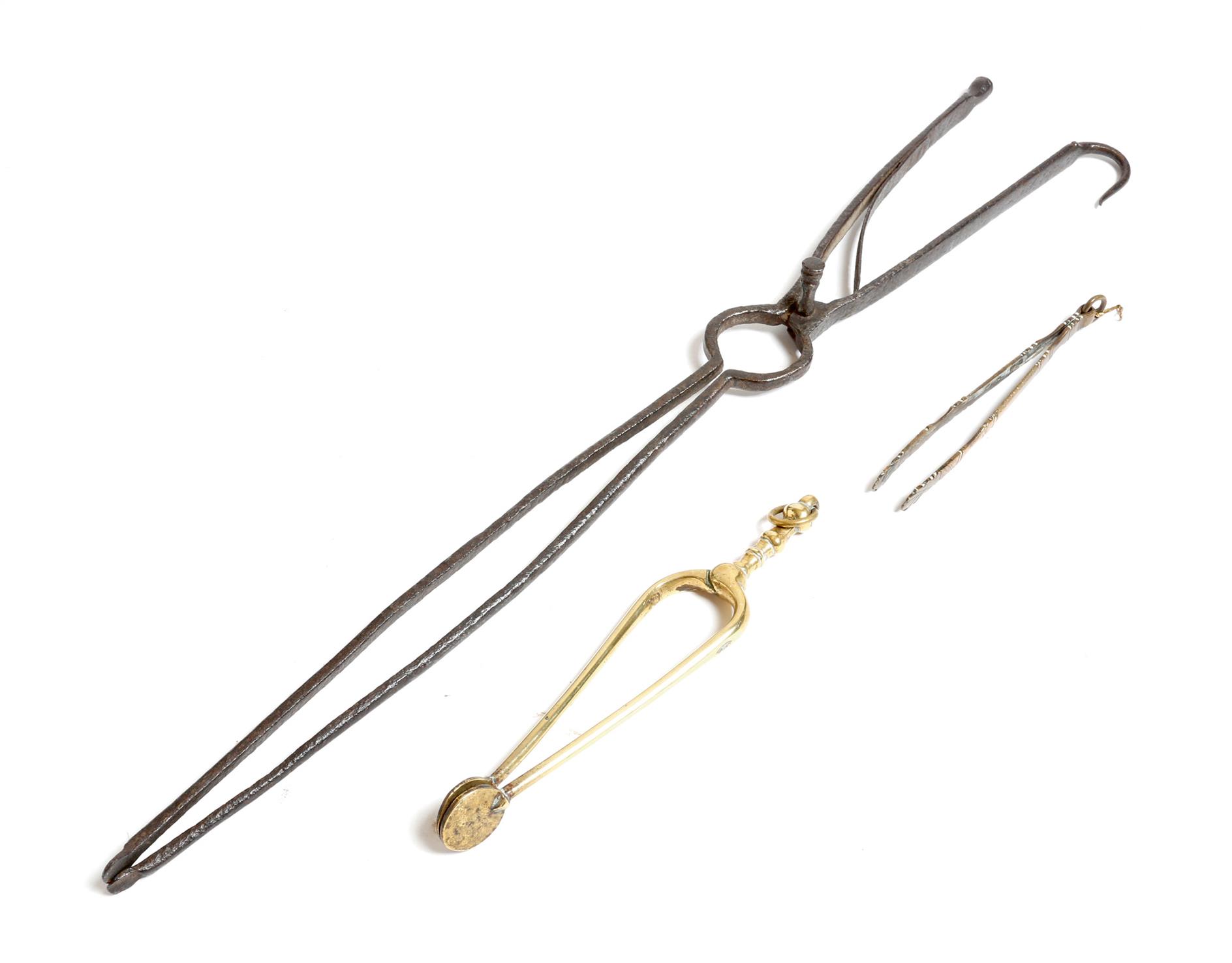 A set of wrought iron ember tongs, with pipe tamper and hook ends, with initials 'M L', probably late 18th century, together with two pairs of brass tongs, 54cm long (max). (3)