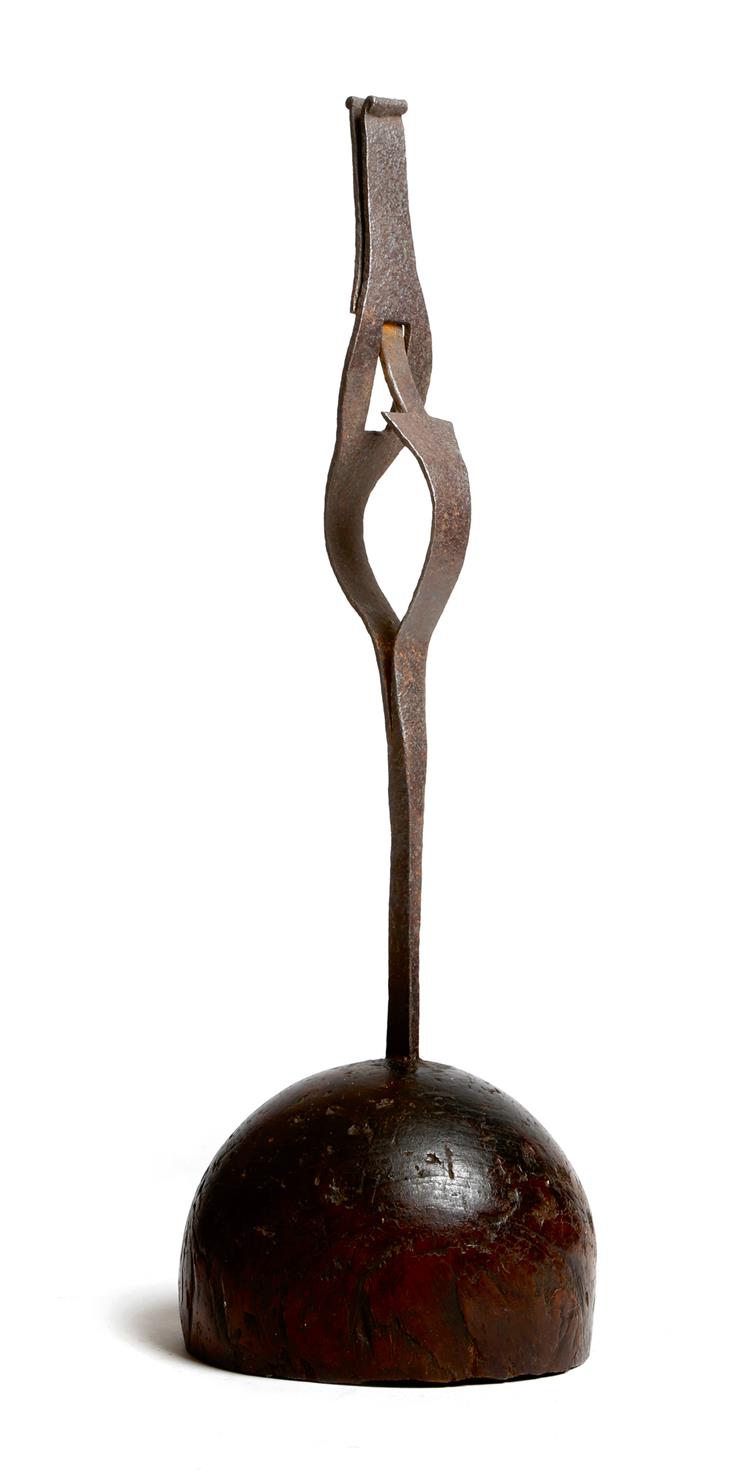 A large early 19th century wrought iron table peerman, on a wooden base, 44.8cm high.