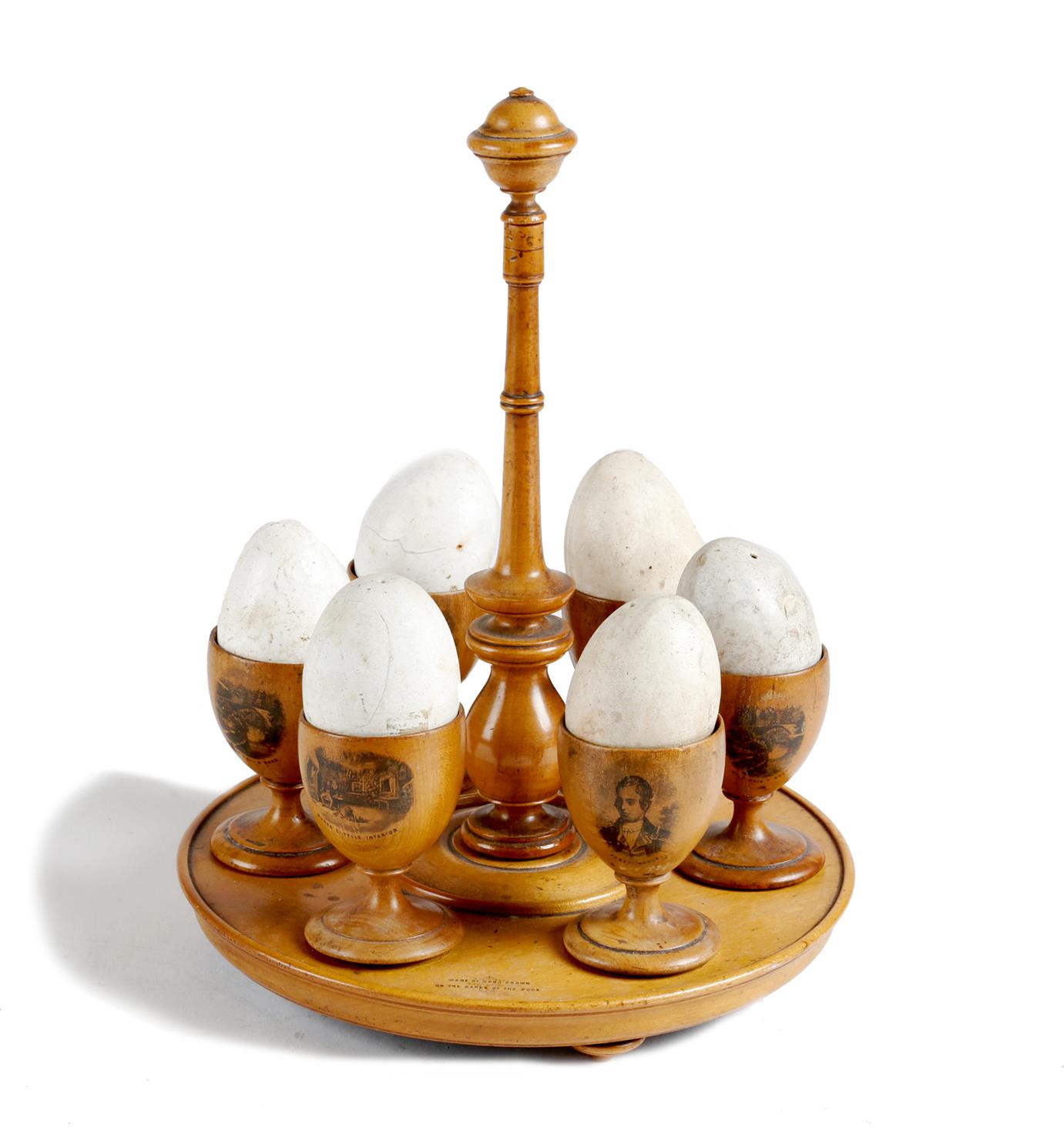 A Victorian Scottish Mauchline ware egg cruet, with six cups each decorated with transfer printed scenes and faux eggs, the base inscribed 'MADE OF WOOD GROWN ON THE DOOR OF THE DOON', 26.7cm high, 20.4cm diameter.