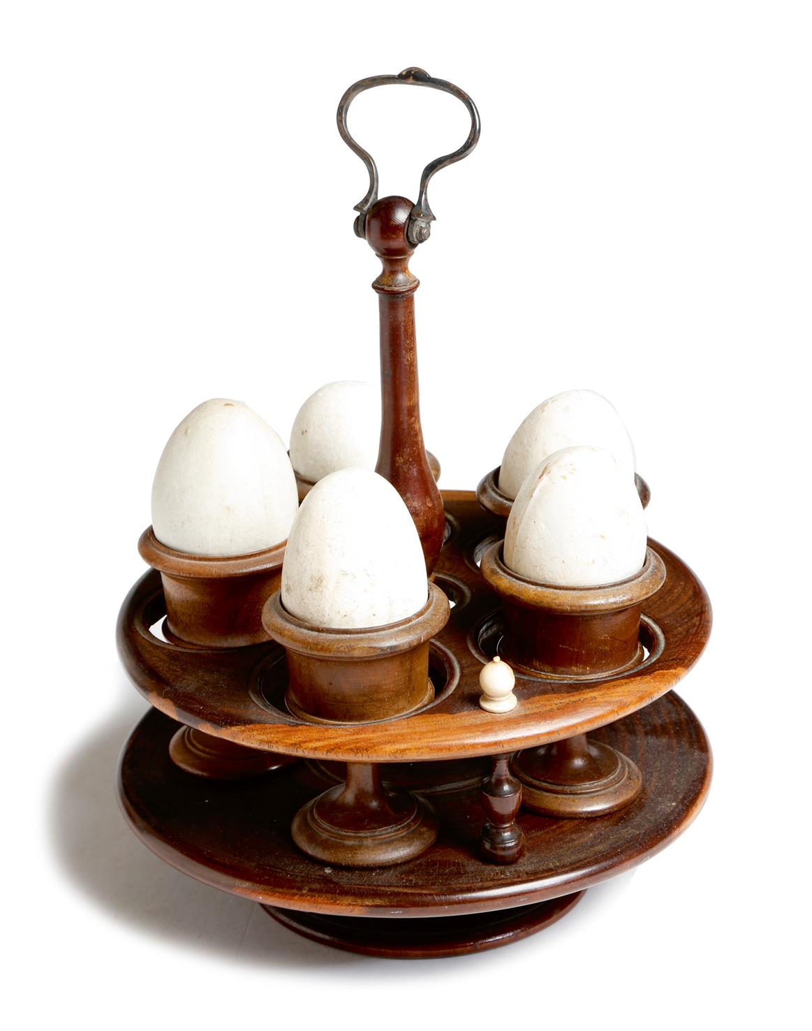 A Victorian treen turned lignum vitae egg cruet, with five associated walnut egg cups and with six faux eggs, with bone finials and a brass handle, 21.5cm high, 18.1cm diameter.