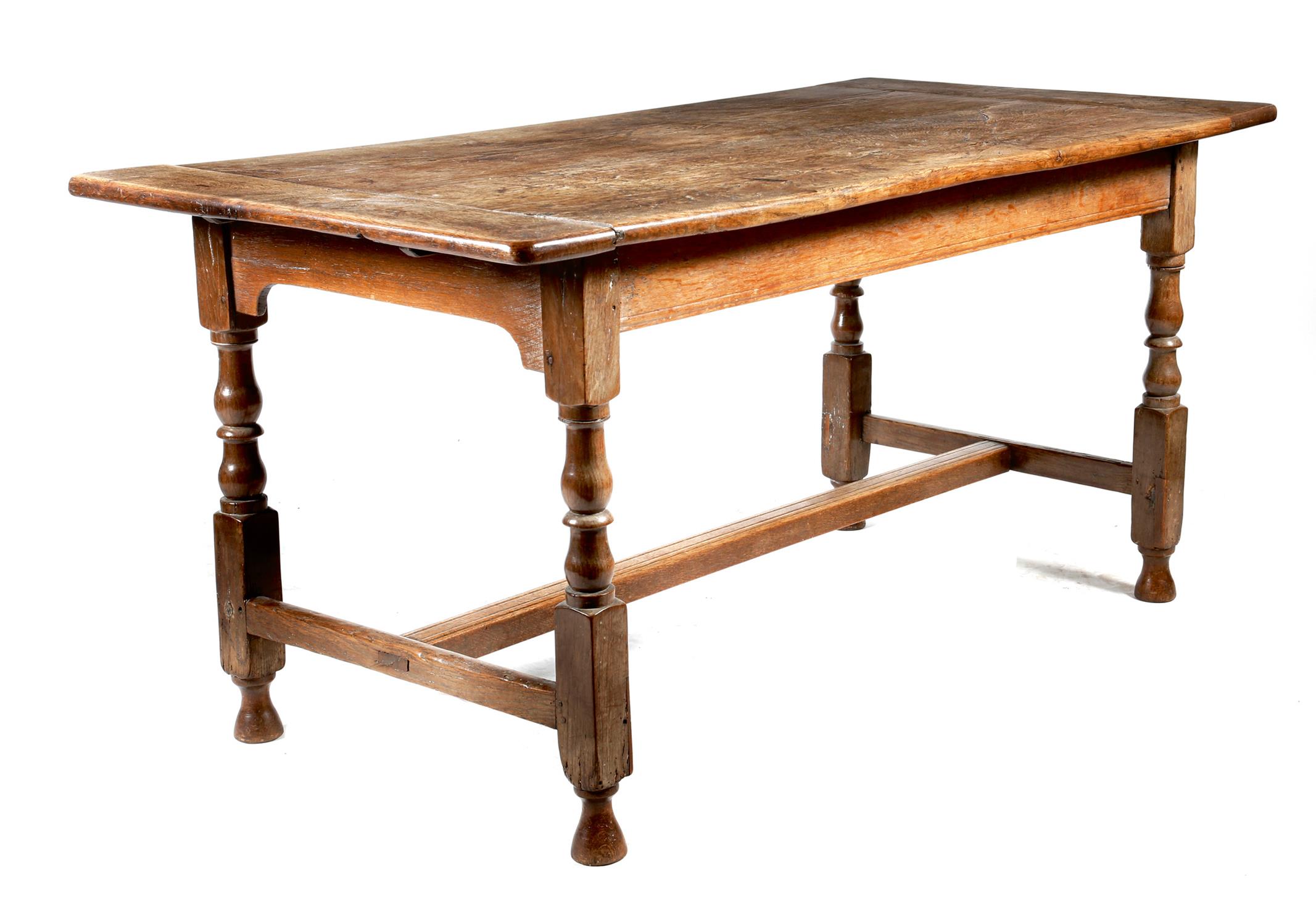 An oak farmhouse kitchen table, the twin plank top with cleated ends, on turned and block supports united by an 'H' stretcher, early 18th century and later, with adaptations, 72.5cm high, 154cm long, 75.5cm deep.