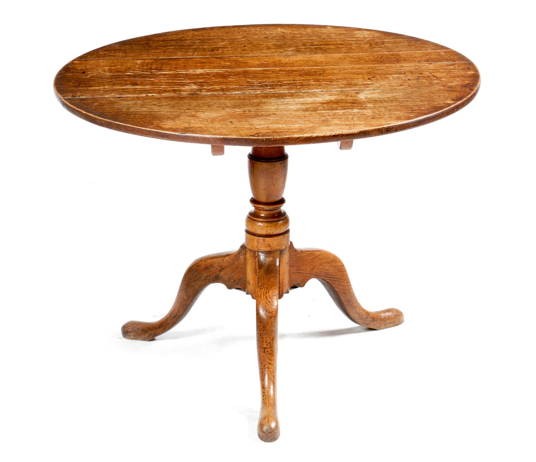 A George III oak tripod table, the circular tilt-top on a vase turned stem and cabriole legs, 63.5cm high, 85.3cm diameter.